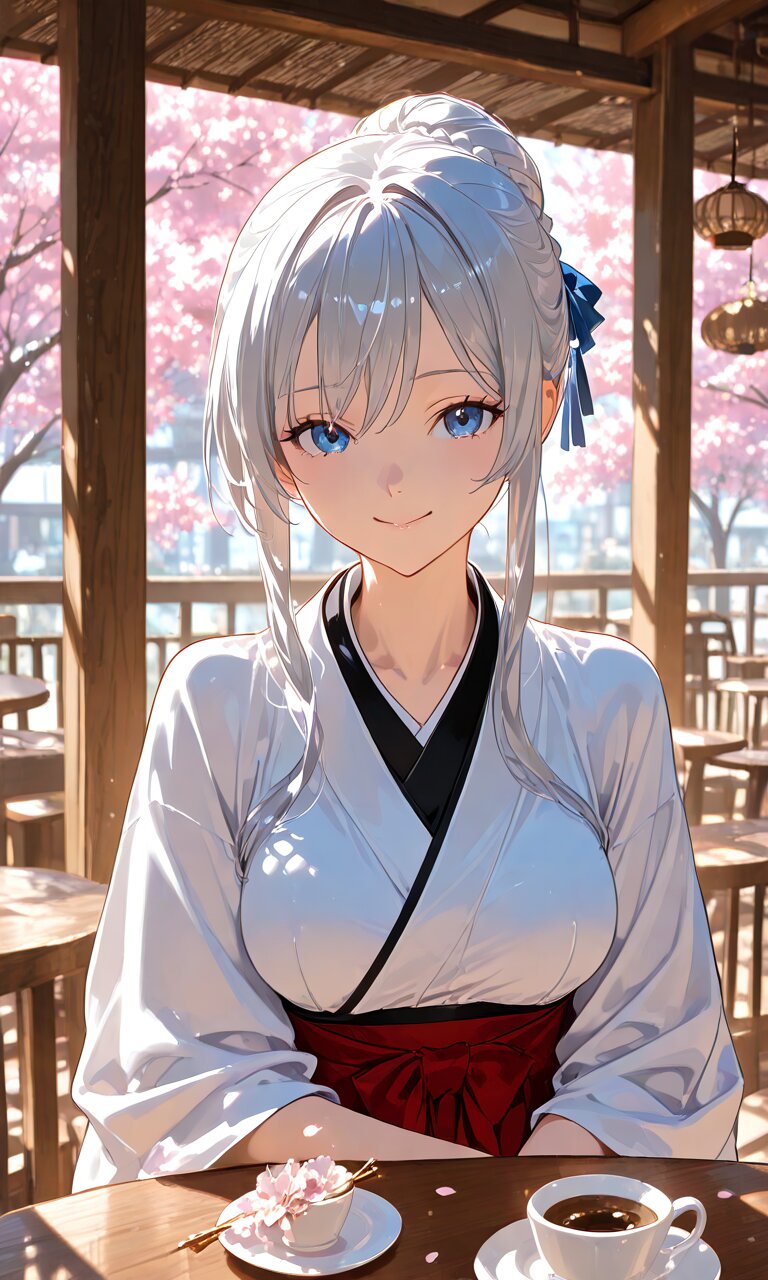 1 lady, hair bun, silver hair blue eyes,breasts, sductive smile, (Japanese cloth), ((cafe, cafe staff, cherry blossoms)),