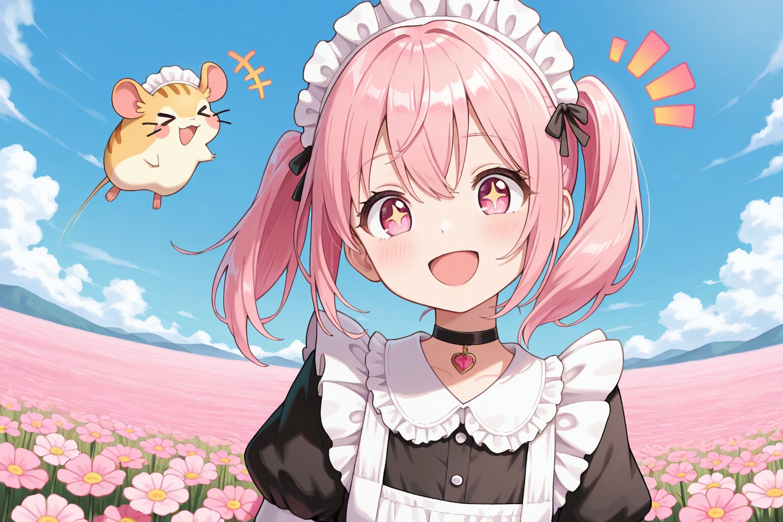 1 little girl, solo, diagonal angle, upper body, panorama, masterpiece, best quality, amazing quality, very aesthetic, pink hair, twintails, pink eyes, +_+, open mouth, smile, cheerful, +++, notice lines, choker, maid outfit, hamsters, > <, phlox field, mountains, clear sky, spring,
