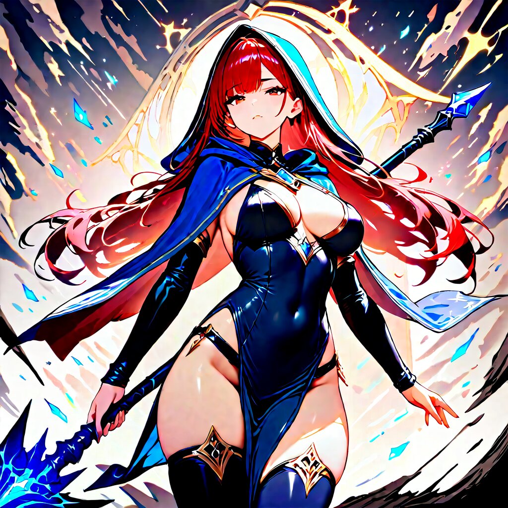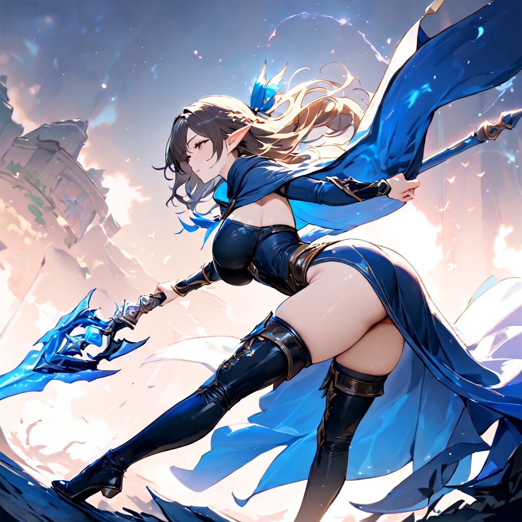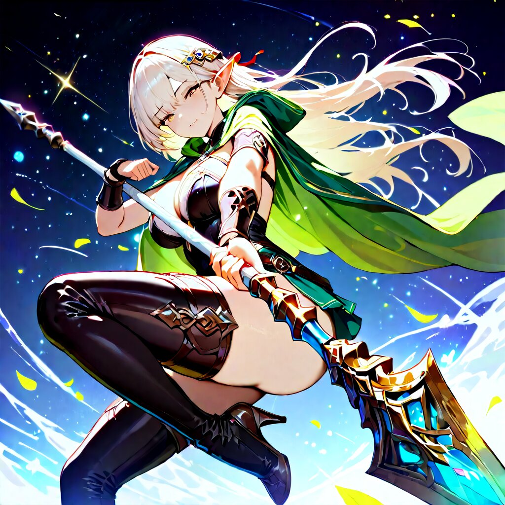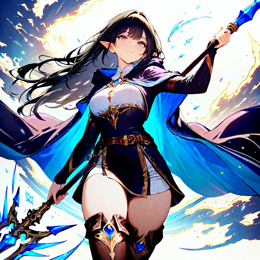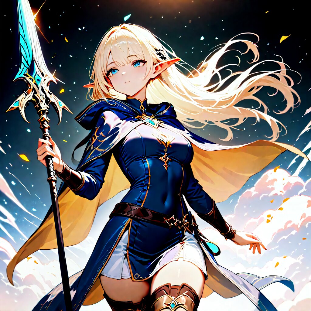 1girl, original,safe, elf, cowboy shot, holding magical spear, blessed mystic cloak and cowl, thigh boots, wizard, miss to focus, nimble, loyal, lawful personality, beautifully detailed face, masterpiece, high score, great score, absurdres,