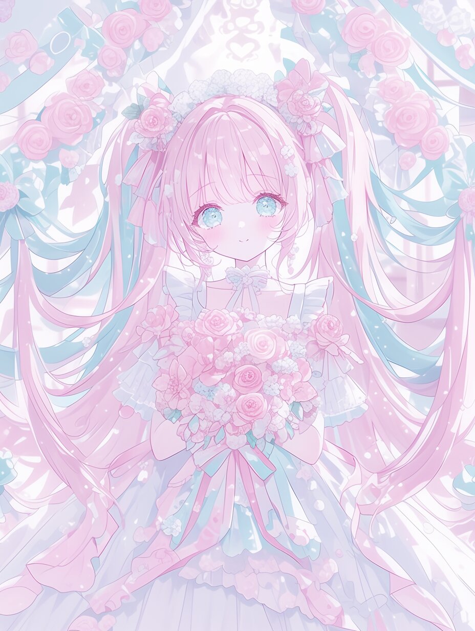 Fluffy pastel pink pigtails, large mint green eyes, long eyelashes, sweet smiles, delicate lace and ribbons, soft pink and baby blue color scheme, mint green flower-shaped hair ornament on both sides of the head, charming idol girl, hold beautiful bouquet