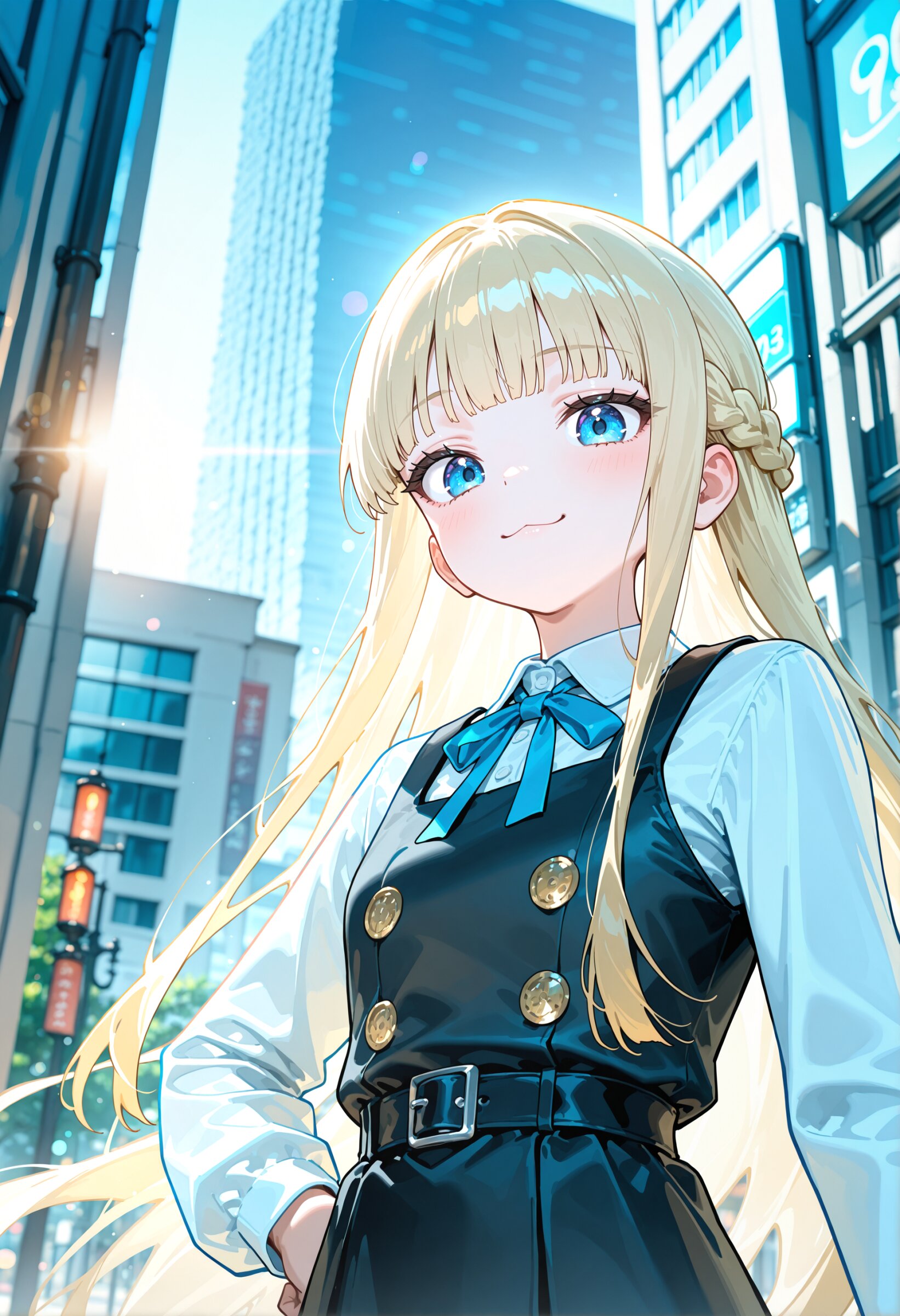 from side (upper body:1.2) from below, looking down (black Pinafore dress in red pea coat, blue neck ribbon, white blouse, 4gold buttons, 1girl (13yo:1.1), overly long sleeves very long hair, french braid, straight hair, hime cut, blond hair, blue eyes, closed mouth smile, :3 smile, hand on hip:1.0), fantasy alternate tokyo \(city\), real world location, city, cityscape, day, depth of field, bokeh, backlighting, afternoon, super fine concept art, hard surface, 8K, unreal engine, masterpiece, best quality, amazing quality, very aesthetic, absurdres, you can add scenery, (volumetric lighting), To make the background more distinctive. professional art lots of details, , overexposure, (watercolor style:1.0), (pastel color style:0.0) <lora:noline (1):-0.5> <lora:sdxl2-flat2-512b:0.15> <lora:facelightup_xl_v10:0.5>
