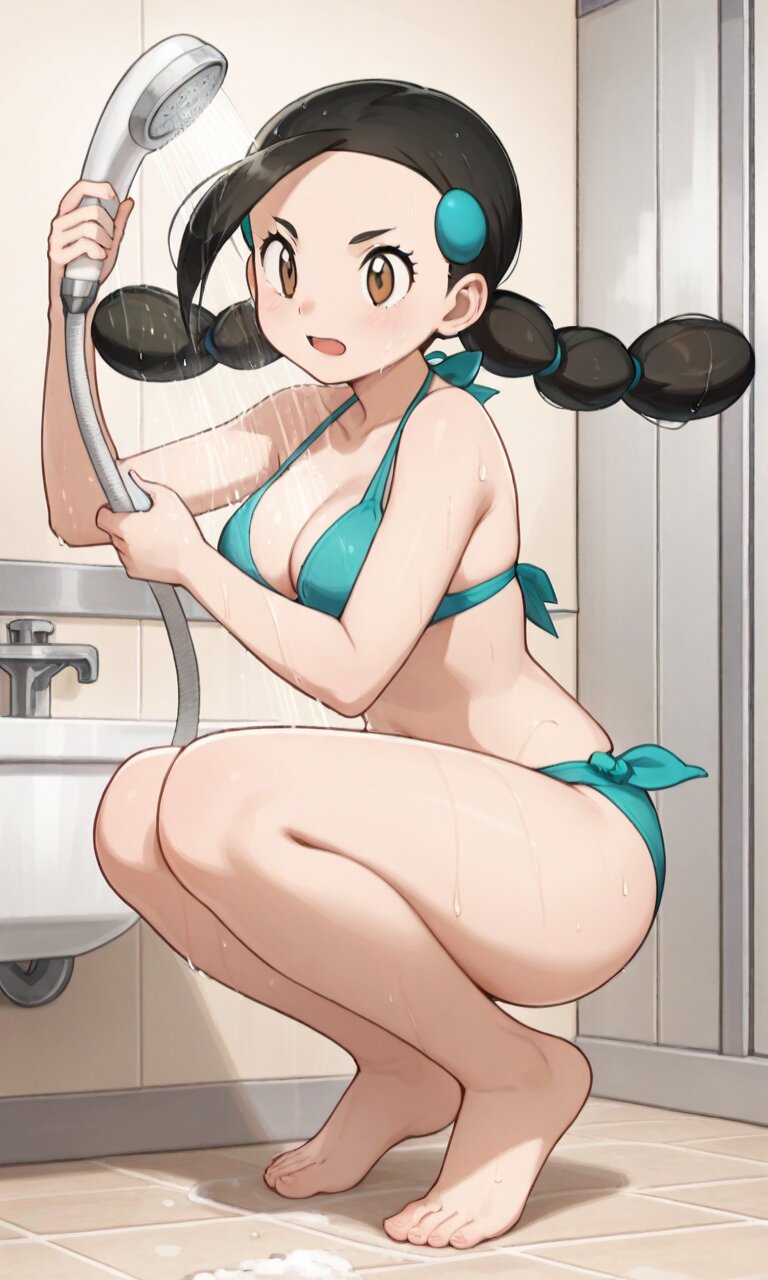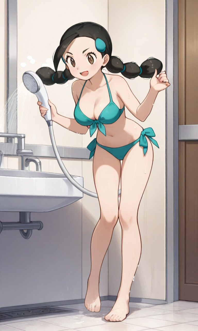 Candice,black_hair, brown_eyes, large_breasts, twintails, hair_ornament, best quality}, {very aesthetic}, {ultra-detailed}, {best illustration} nsfw, perfect hands, perfect face, perfect eyes, perfect light, dynamic light, natural light, full body woman in very cute outfit holding a shower head and posing near the sink for a picture, 1girl, solo, shower head, breasts, swimsuit, bikini, showering, barefoot