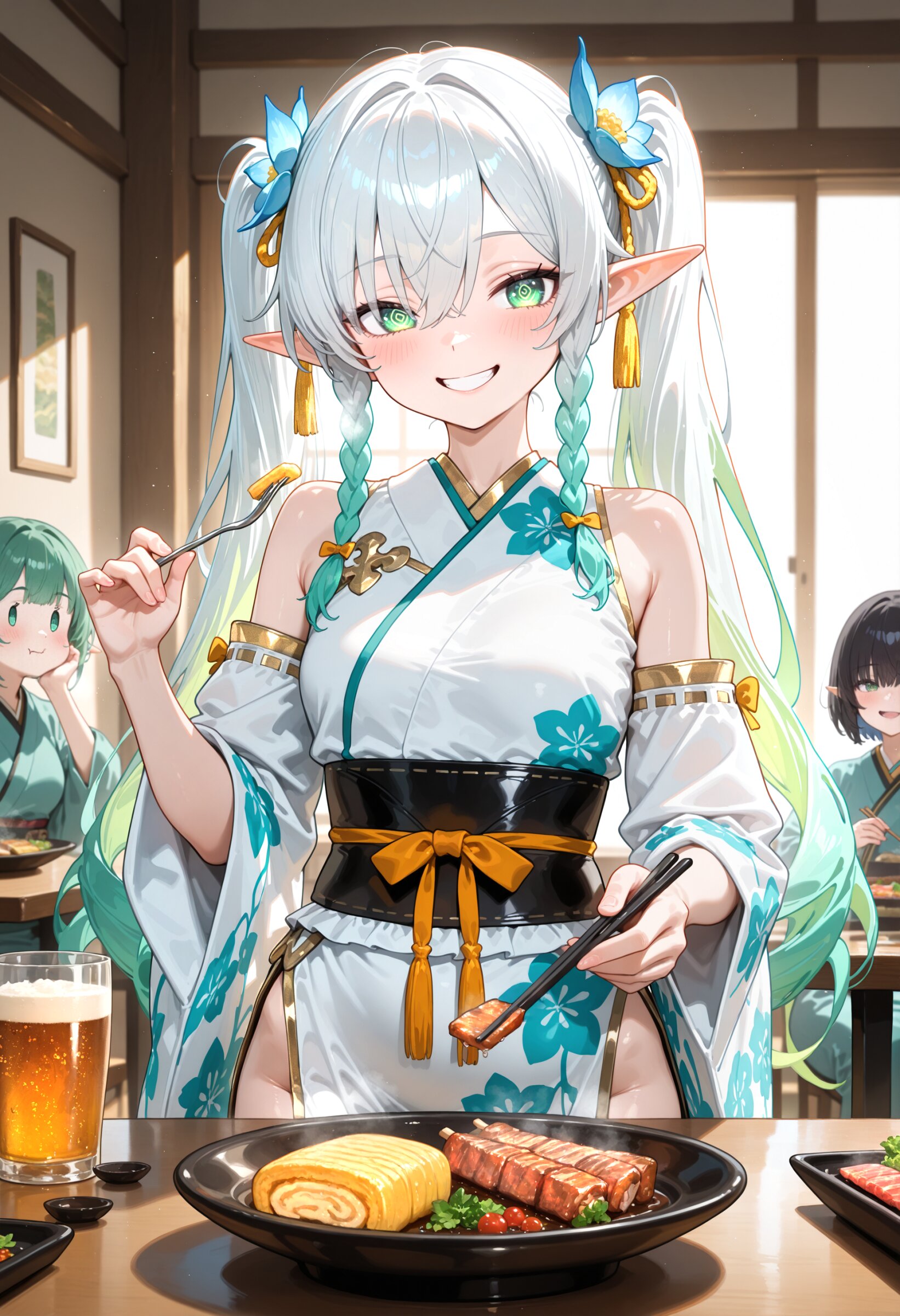 multiple girls, 3girls, (elf girls:1.2), , having a drinking party at a old japanese bar,. They are seated around a round table, drinking, chatting, and enjoying their food. Please show their joyous expressions and the sense of camaraderie between them, (noon:1.0), soft natural sunlight, (cowboy shot:1.1), , , cinematic angle, , perfect anatomy, , with chopsticks, spoon, , eating beautiful cut Japanese tamagoyaki on black plate, sashimi on plate, , Yakitori on plate, professional anime art lots of details, , overexposure, shiny-glistening, (watercolor style:1.0), (pastel color style:1.3) you can add scenery, (volumetric lighting), To make the background more distinctive. super fine concept art, hard surface, 8K, unreal engine, masterpiece, best quality, amazing quality, very aesthetic, absurdres, newest, ambient occlusion, raytracing, <lora:noline (1):-0.5> <lora:sdxl2-flat2-512b:0.0> <lora:facelightup_xl_v10:0.5> (cowboy shot:1.1), , , cinematic angle young elf girls sitting on comfy chair,(shiny skin:1.0), shoulder length hair, tri braids nihongami , shiny hair, insanely beautiful teal green eyes, first-rate female bodies, perfect body, small breasts, tone hips, (embarrassed:0.8), (drunkard, happy:1.1), solid oval eyes,, @ @, pout, (seductive smile:1.1), elven dress, leaf-patterned cloak, leather boots, , looking at viewer, detached sleeves dynamic lighting, sunlighting, warm sunlight, (perfect anatomy:1.2), cute girls, extremely detailed, perfect face, perfect eyes, (depth of field),warm, Comfy, Soft Lighting, shiny smile fantasizing expression, daydreaming, imaginative, creative,,, beautiful cut Japanese tamagoyaki on black plate, (drink glass of beer:1.0), cutlery on the table, glass of water, fork on the table, cutlery on the table,fork ,spoon, , happy smile, super fine concept art, hard surface, 8K, unreal engine, masterpiece, best quality, amazing quality, very aesthetic, absurdres, newest, ambient occlusion, raytracing, (noon:1.0)