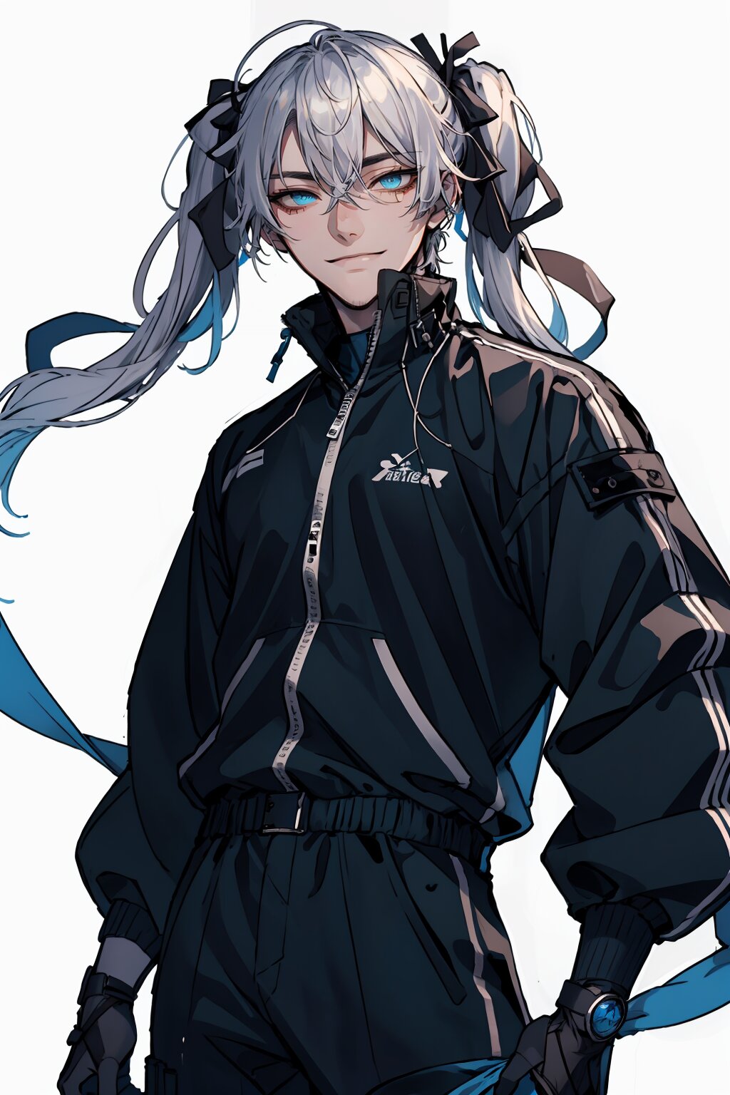 (male focus:1.8),absurdres,detailed and intricate, (best quality), BREAK,(cowboy shot:1.5),solo,(1 boy:1.5),(adult male:1.4),(smile),happy,super beautiful,beautifu eyes,vibrant eye,beautiful and delicate eyes, BREAK,sharp nose,facial muscle,long-shaped facel,male eyebrows, male eyes, eyes in highlight,delicate facial features,broad shoulders, BREAK,(white hair),inner blue colour hair,(long hair:1.5),(twintails:1.5), BREAK,(blue eyes), BREAK,tuxedo,(Techwear:1.2),long sleeve,Pants,(Punk fashion:1.3), BREAK,(dynamic Angle:1.2),shoot from below,cinematic angle,