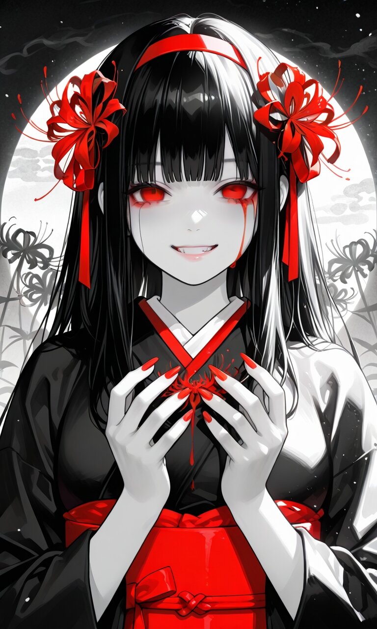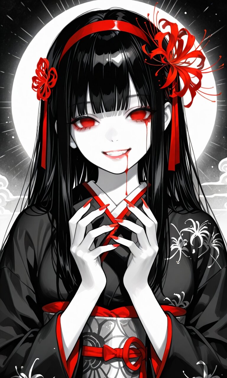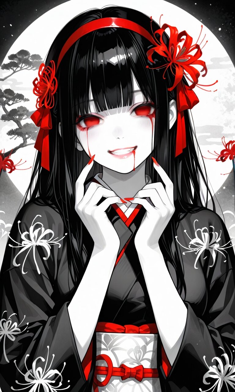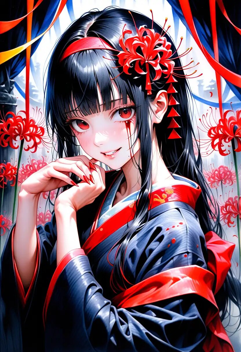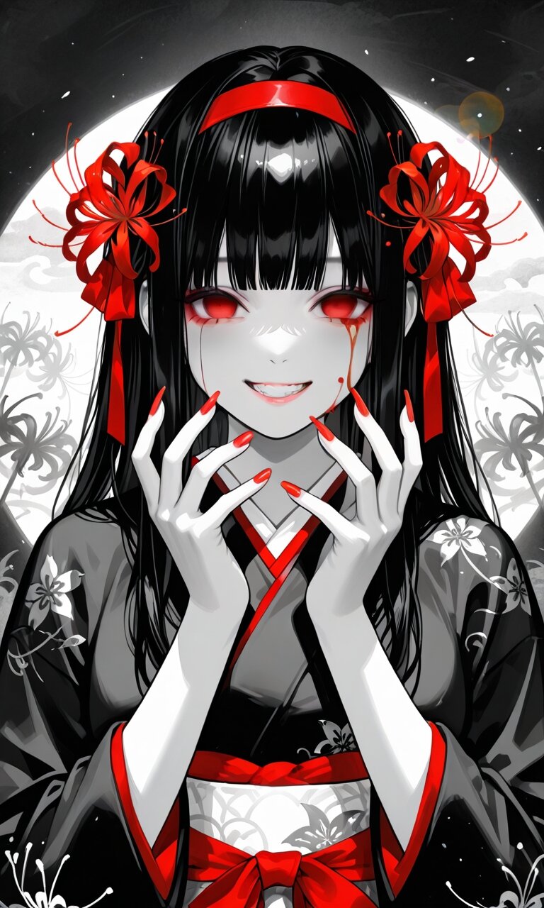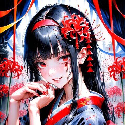 1girl, solo, long hair, looking at viewer, black hair, long sleeves, hair ornament, red eyes, upper body, sidelocks, hairband, japanese clothes, blunt bangs, hair flower, wide sleeves, nail polish, grin, red ribbon, hands up, sash, blood, obi, red flower, red nails, spot color, long fingernails, sharp fingernails, hime cut, black kimono, spider lily, blood spray, blood from eyes, empty eyes,