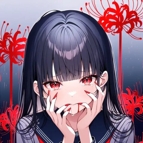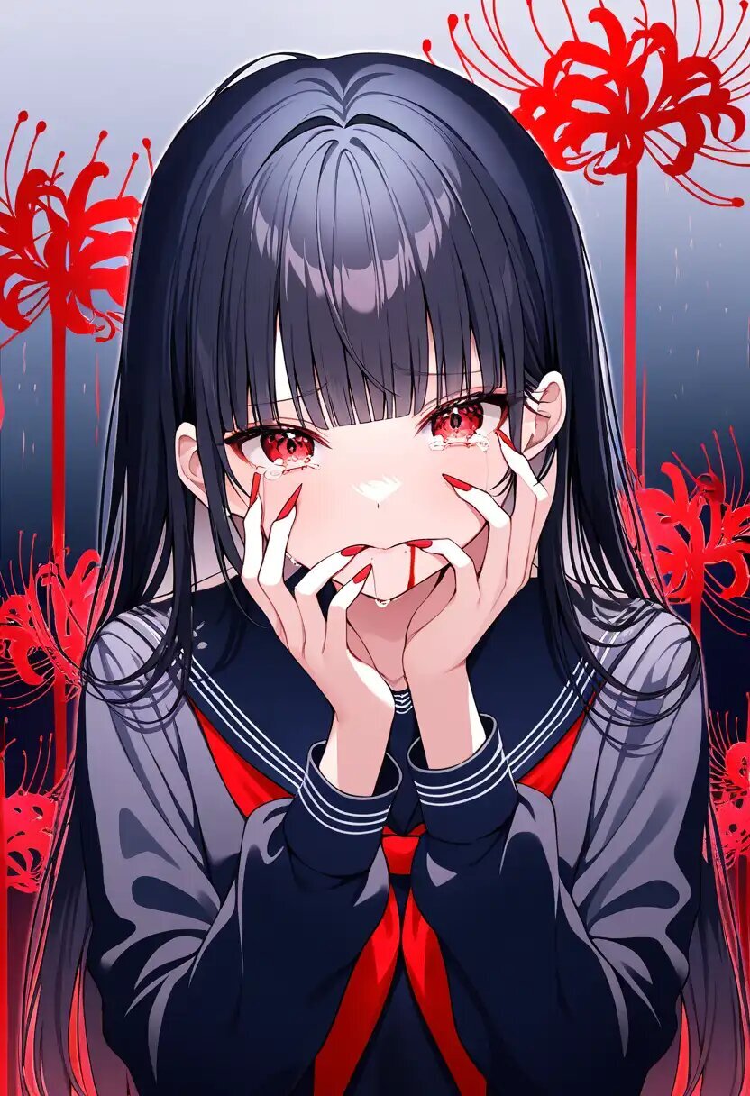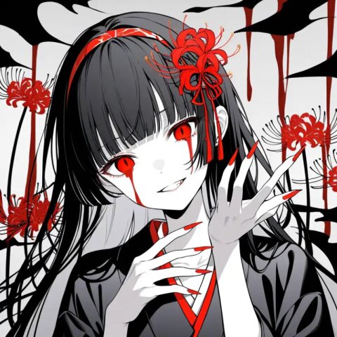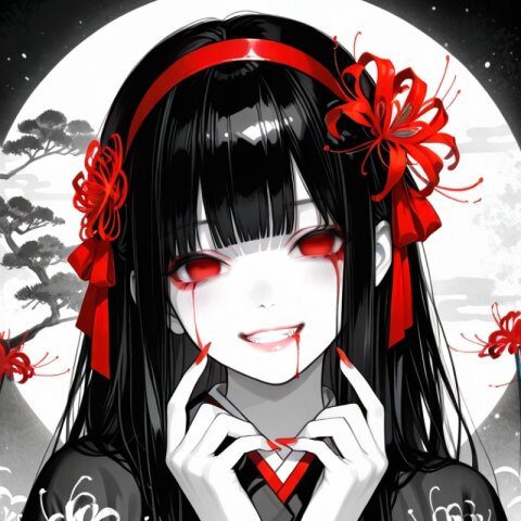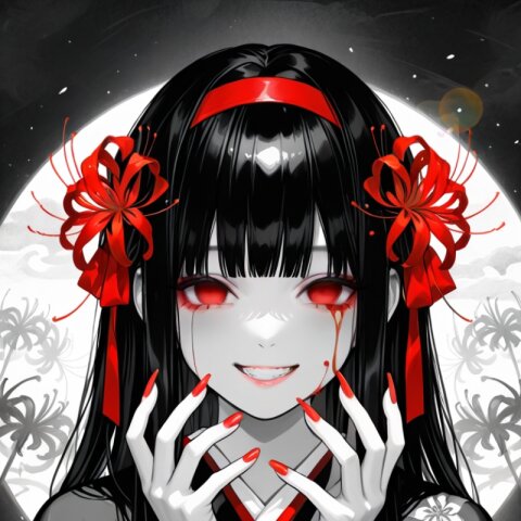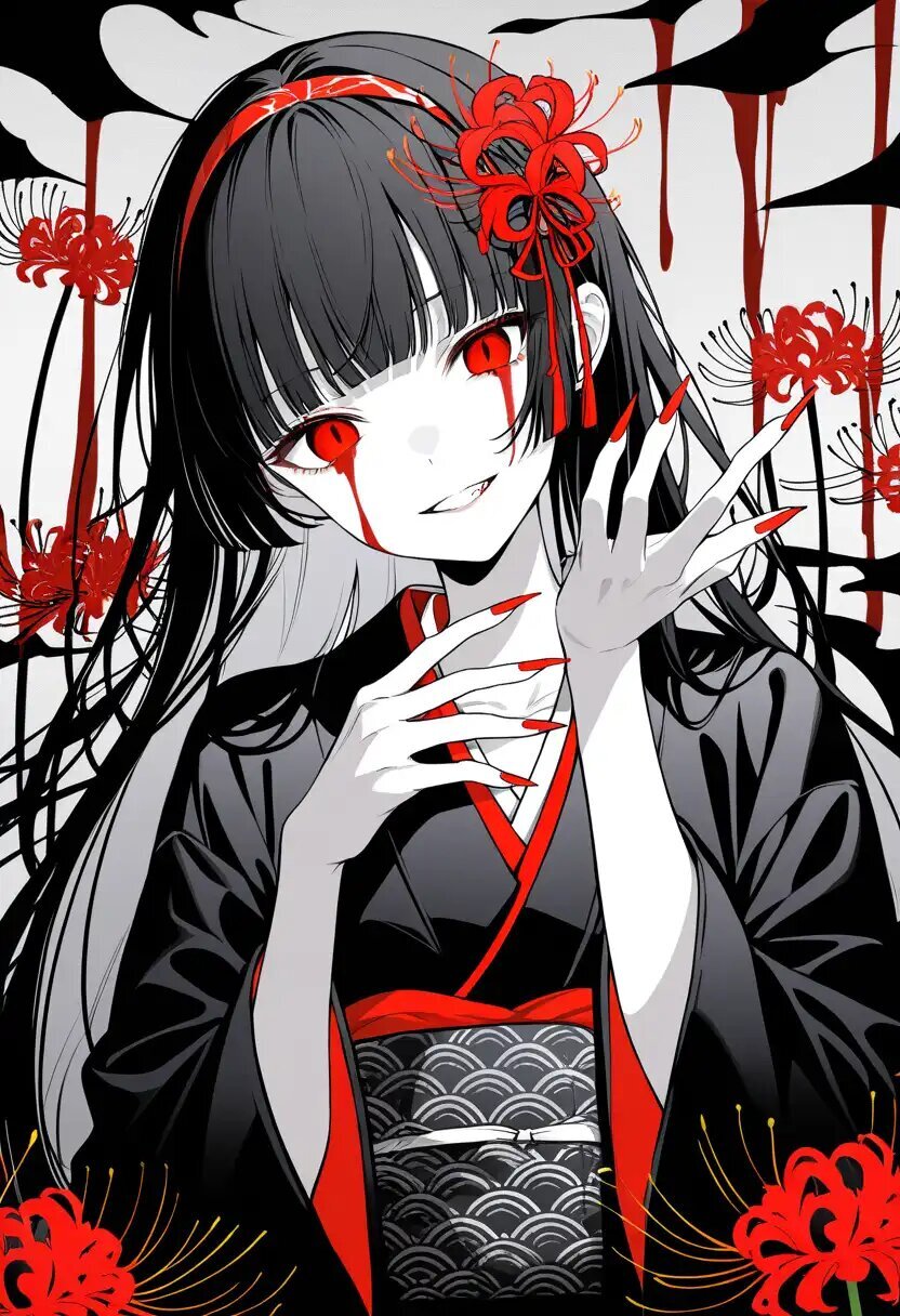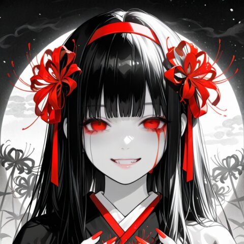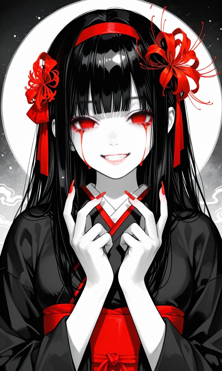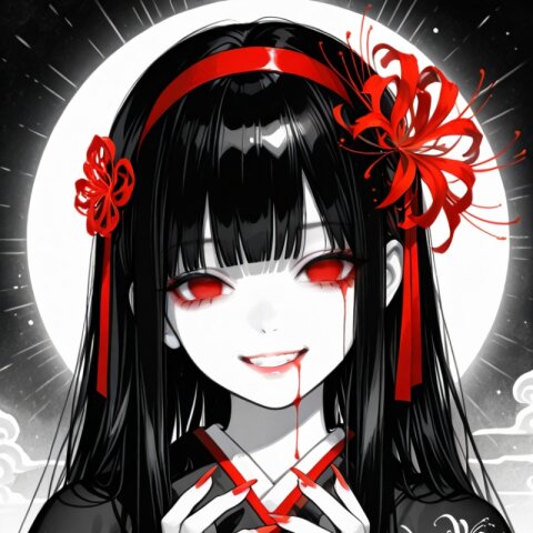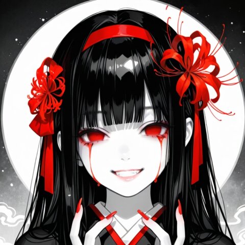 1girl, solo, long hair, looking at viewer, black hair, long sleeves, hair ornament, red eyes, upper body, sidelocks, hairband, japanese clothes, blunt bangs, hair flower, wide sleeves, nail polish, grin, red ribbon, hands up, sash, blood, obi, red flower, red nails, spot color, long fingernails, sharp fingernails, hime cut, black kimono, spider lily, blood spray, blood from eyes, empty eyes,