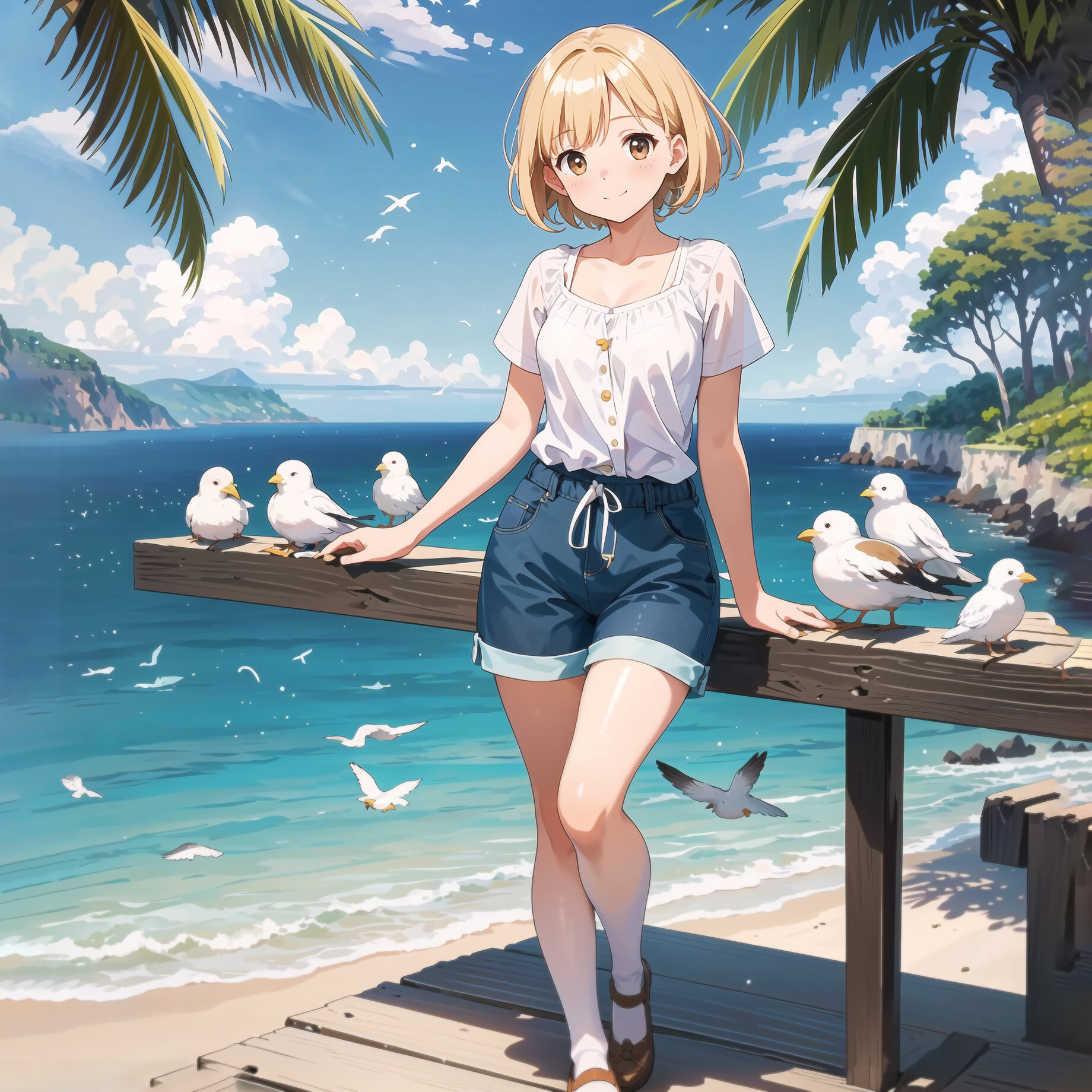 (masterpiece,high resolusion,illustration,ultra detailed 8k art,extremely detailed CG,official art,clothes reflecting light,detailed shiny skin,detailed background:1.3), ((highly detailed beautiful face and eyes)),(2 woman,30yo:1.5),(small breasts:1.4),(curvy:1.4), (beautiful brown short hair,beautiful brown eyes:1.2),(laughing widh open eyes,blush,1.1),(closed mouth:1.0),(dutch angle:1.3), (fullbody shot:1.4), <lora:MultipleGirlsGroup:0.25:lbw=pose>(2girls,lineup:1.45),(small birds:1.4), (woman traveling solo in early summer, walking along the cliffs of the Amalfi Coast. She wears a flowing floral maxi skirt, a simple white tank top, a lightweight silk scarf fluttering in the sea breeze, and espadrilles. The sun is low, casting a warm orange glow over the turquoise water. Her eyes reflect wonder and freedom. Romantic atmosphere, coastal serenity, captured in soft-focus,seagull) outside, (magnificient view,surrounded by small birds resting on her and around her:1.4), <lora:jk fashion_v2:0.7:lbw=ware>, (jk fashion,short sleeves,casual clothes,shorts,legwear:1.3), (beautiful brown eyes:1.3),<lora:flat2:-0.3>,<lora:tareme_gen3_dim1:0.4> <lora:glowingdust_20230806143817:0.2:lbw=back>(BOKEH:1.5),(nice hands,perfect hands:1.0),<lora:GoodHands-vanilla:1>(blonde hair:1.1),