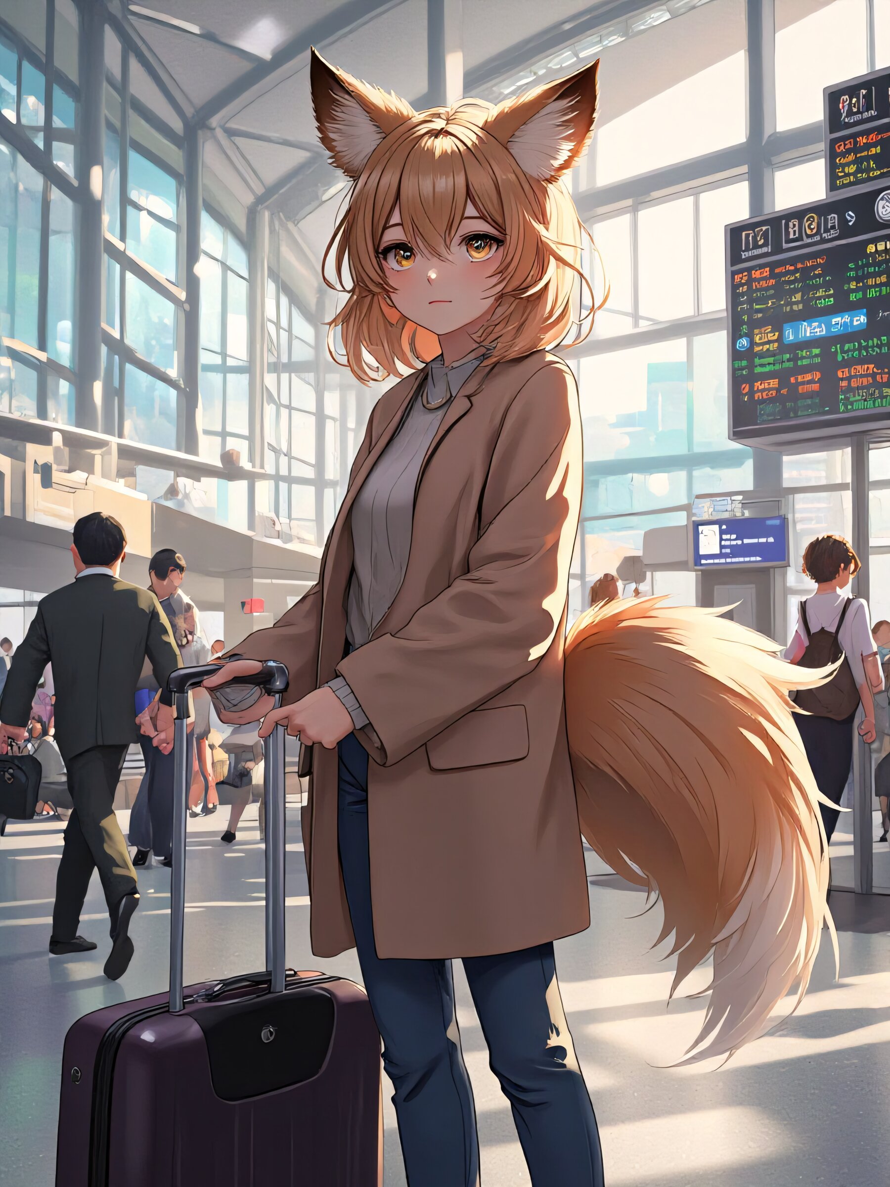 A highly detailed, realistic portrait of a fox-eared girl with light brown hair, standing confidently in a bustling airport terminal. Her golden eyes shimmer with anticipation as she grips the handle of a sleek, well-worn suitcase beside her. Her fluffy fox tail sways gently behind her, reflecting the excitement of the journey ahead. She wears a stylish yet practical outfit—perhaps a modern traveler’s coat draped over a casual dress, a sophisticated business suit, or a cozy sweater paired with comfortable jeans. The background features towering glass windows with sunlight filtering through, busy crowds moving with purpose, and sleek digital departure boards displaying flights—enhancing the dynamic and adventurous atmosphere