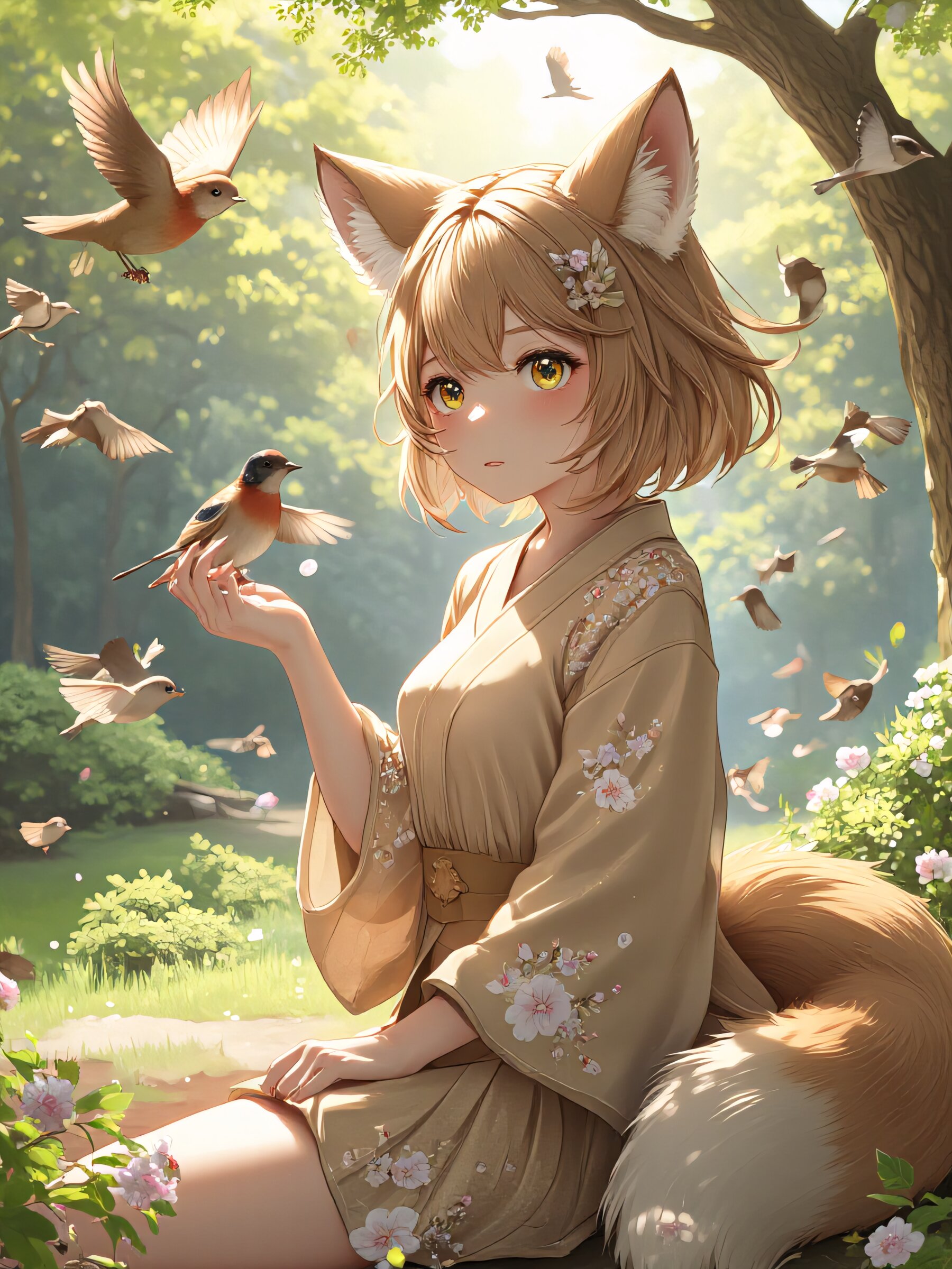 A highly detailed, realistic portrait of a fox-eared girl with light brown hair, sitting peacefully in a lush park surrounded by birds in mid-flight. Her golden eyes shimmer with gentle admiration as she extends her hand, allowing a delicate songbird to perch gracefully on her fingertips. Her fluffy fox tail rests elegantly beside her, blending into the tranquil scene. She wears a beautifully crafted outfit—perhaps a soft, earth-toned kimono with subtle feather-like embroidery, a cozy sweater paired with a flowing skirt, or a nature-inspired dress adorned with gentle floral patterns. The background features a serene aviary bathed in soft sunlight, a tranquil forest clearing with birds singing in harmony, or a traditional Japanese garden where sparrows flit between blossoming trees—enhancing the peaceful and nurturing atmosphere.