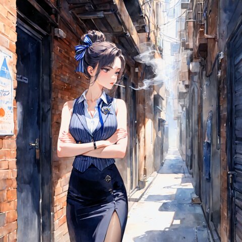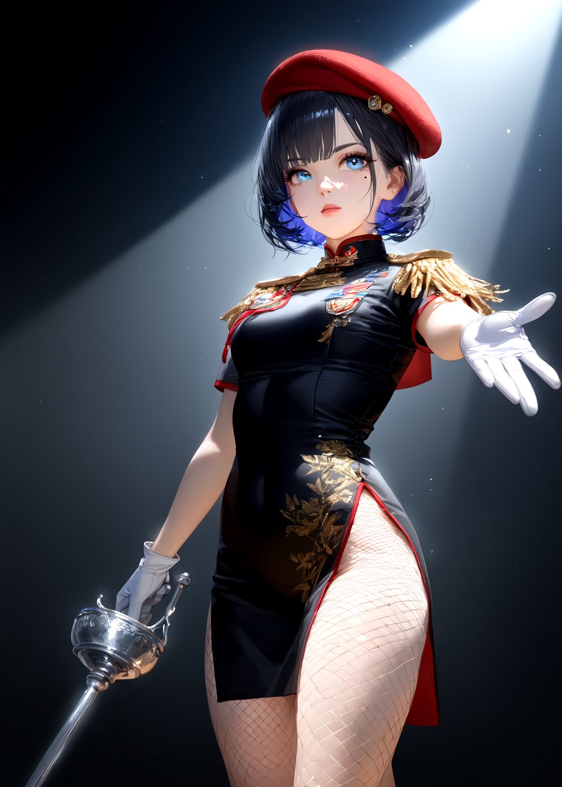 (delicate facial features, ultra high res, extremely detailed eyes and face, perfect anatomy:1.2,super detailed skin,cinematic lighting, cinematic shadow,photorealistic,) cowboy shot,bokeh, military uniform,contrapposto, wide stance, very long gray chinese dress, gray short sleeves, military red beret, epaulet, rank insignia, abbreviation, lapel pin, epaulettes, epaulet, military ribbon, white short gloves, mole,mole under eye, very short cut, detaioled light blue colored inner black hair, super detailed streaked hair, long bangs, detailed light blue eyes, heavy makeup, botanical embroidery fishnet tights, <lora:legs_detailed_2.0:0.66> detailed_legs, legs, <lora:DetailedPerfect_hands_r1:0.63> detailed hands, perfect hands, solo, fingernails, realistic, semi-realistic hands, gradient, palms, outstretched hand, fingers <lora:add-detail-xl:0.61> portrait, <lora:DetailedEyes_V3:0.66> detailed eyes, <lora:rapier_pony_ex_c12_d16:0.89> holding sword rapier