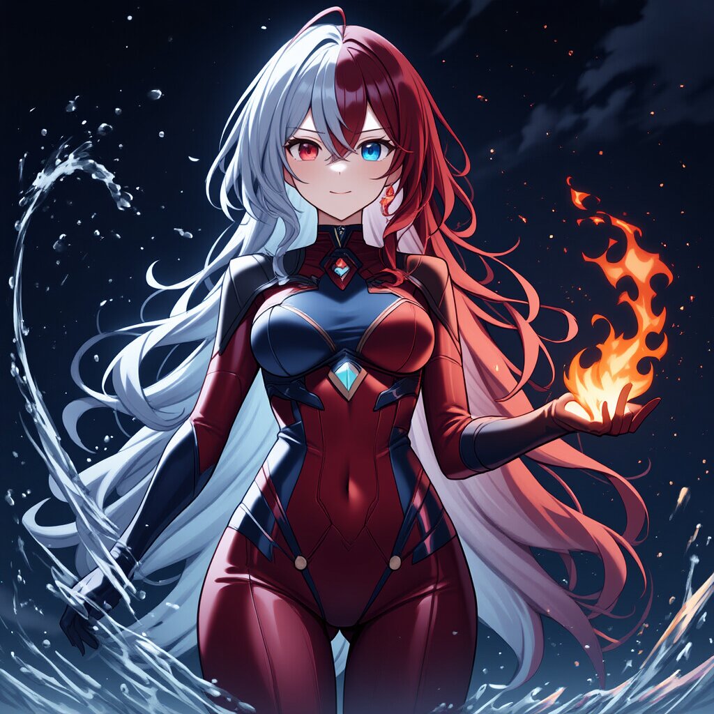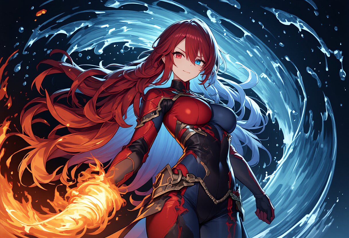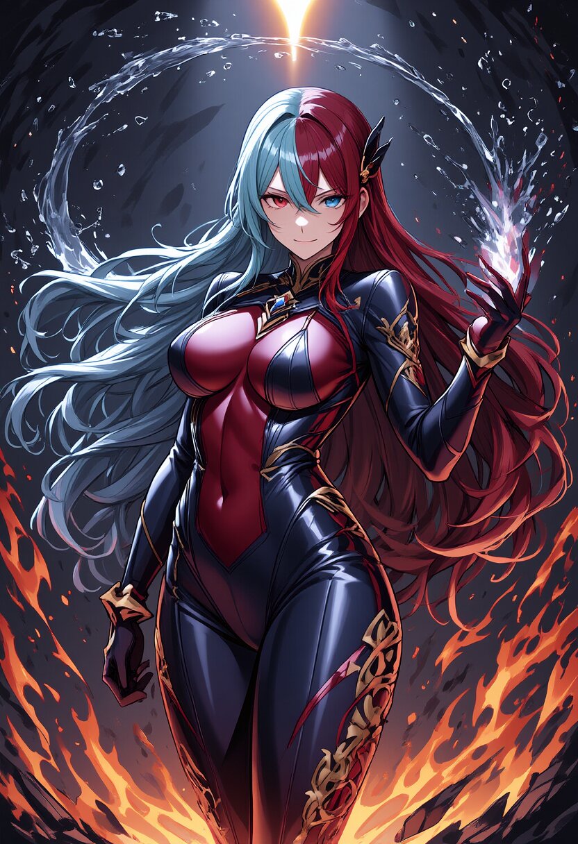 {{{highly detailed}}}, {{{interspecies}}}, {{{beautiful detailed}}}, style of ai-generated, 1girl, solo, {{heterochromia, red eyes, blue eyes}}, very long hair, {{wavy hair}}, {{{{light blue hair, dark red hair, two-tone hair}}}}, hair between eyes, large breasts, {{serious, smile}}, red and blue bodysuit, cowboy shot, flame, water stream, flame, water, flame tornado, water tornado, {{manipulate flame, manipulate water}}, {{{masterpiece}}}, {{{best quality}}}, {{{very aesthetic}}}, {{{ultra-detailed}}}, {illustration}, {{{extremely detailed}}}, {{{an extremely delicate and beautiful}}}