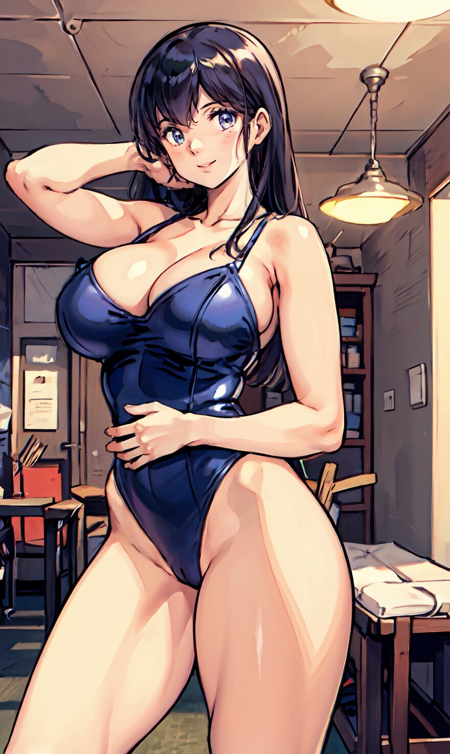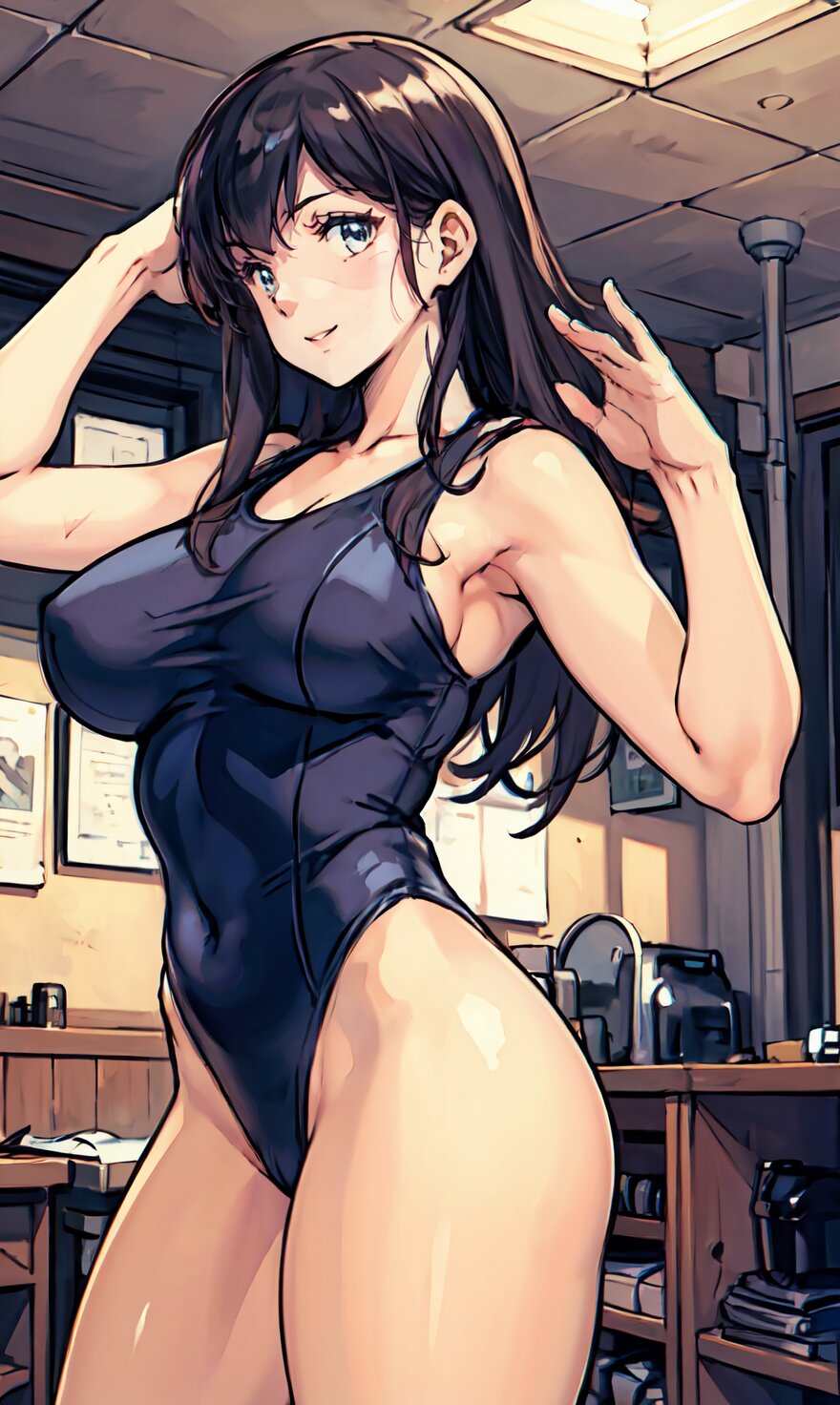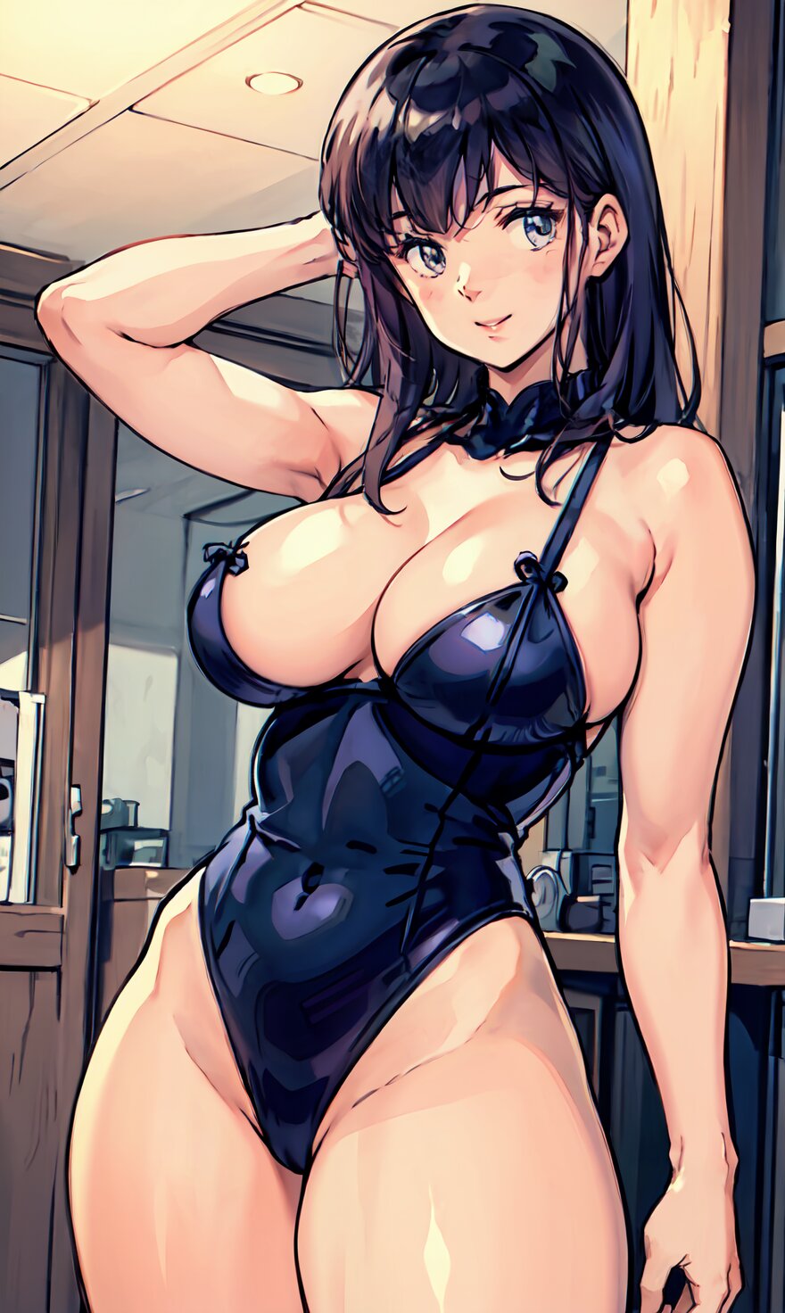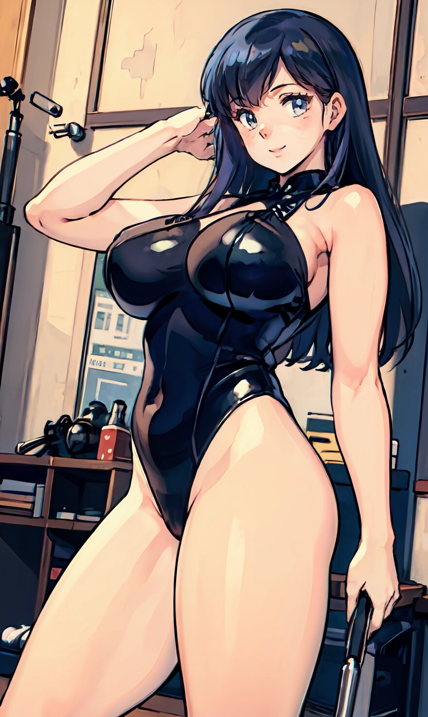 (8k, best quality, masterpiece:1.4), (realistic, photo-realistic:1.6), HDR, (incredibly absurdres:1.2), (vibrant color:1.2), ultra-detailed, (random pose, from front: 1.6), 1girl, solo, 22 years old, (chubby, huge breasts: 1.4), black long hair, (close up face: 1.2), perfect body, highly detailed, shiny skin, shiny hair, looking at viewer, (sexy Plunge leotard: 1.4), walking in the GYM, <lora:Oto_v01:0.8>