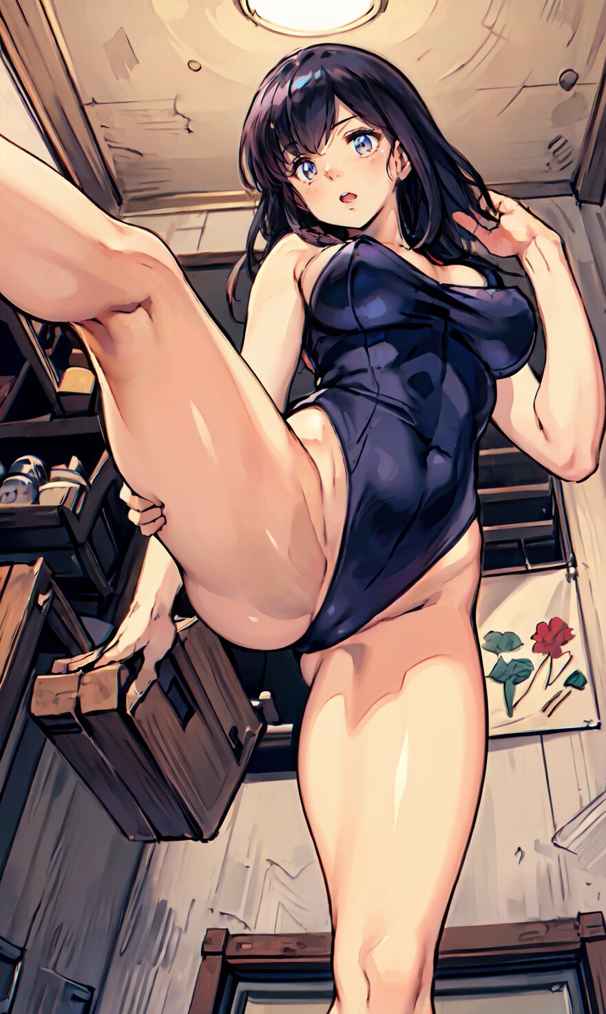 (8k, best quality, masterpiece:1.4), (realistic, photo-realistic:1.6), HDR, (incredibly absurdres:1.2), (vibrant color:1.2), ultra-detailed, (random pose, from below: 1.6), 1girl, solo, 22 years old, (chubby, huge breasts: 1.4), black long hair, (close up face: 1.2), perfect body, highly detailed, shiny skin, shiny hair, looking at viewer, (sexy Plunge leotard: 1.4), (a leg up: 1.8), in the GYM, <lora:Oto_v01:0.8>