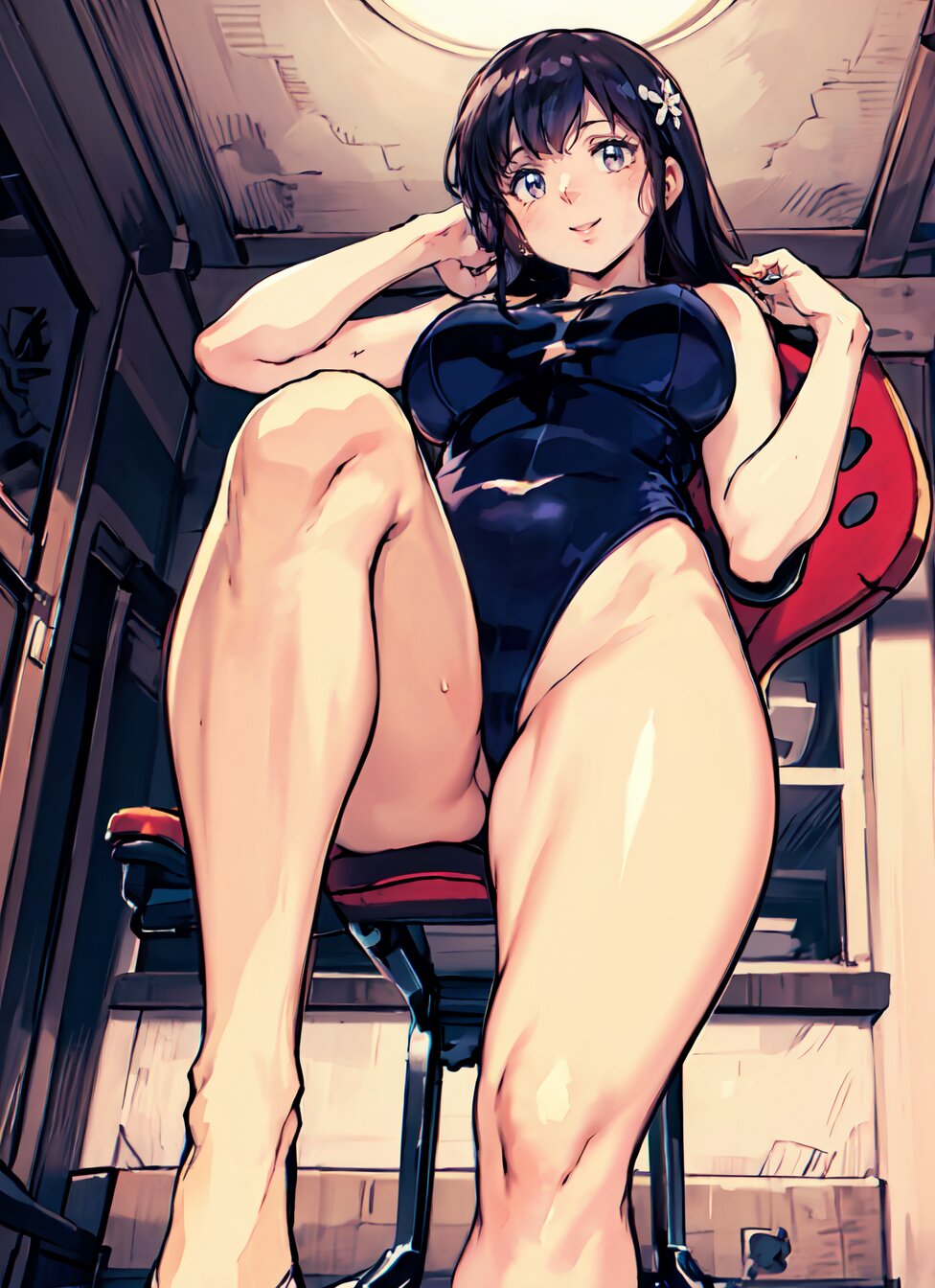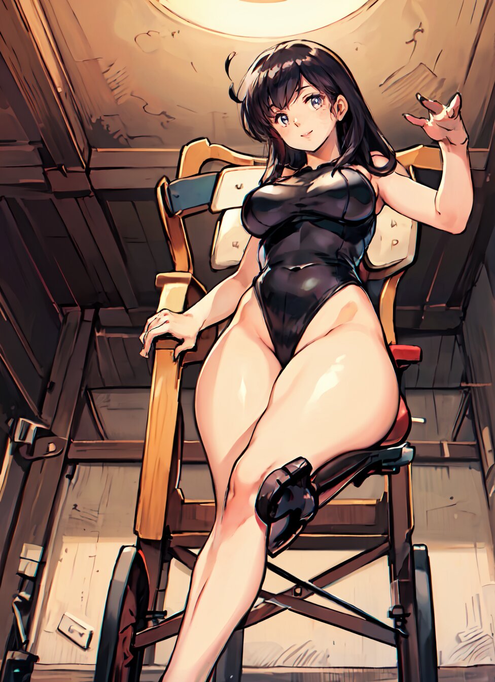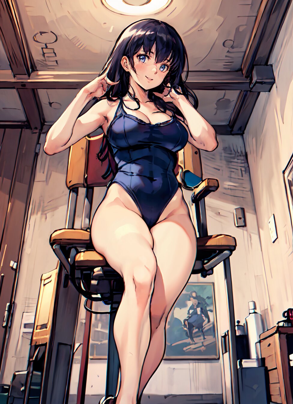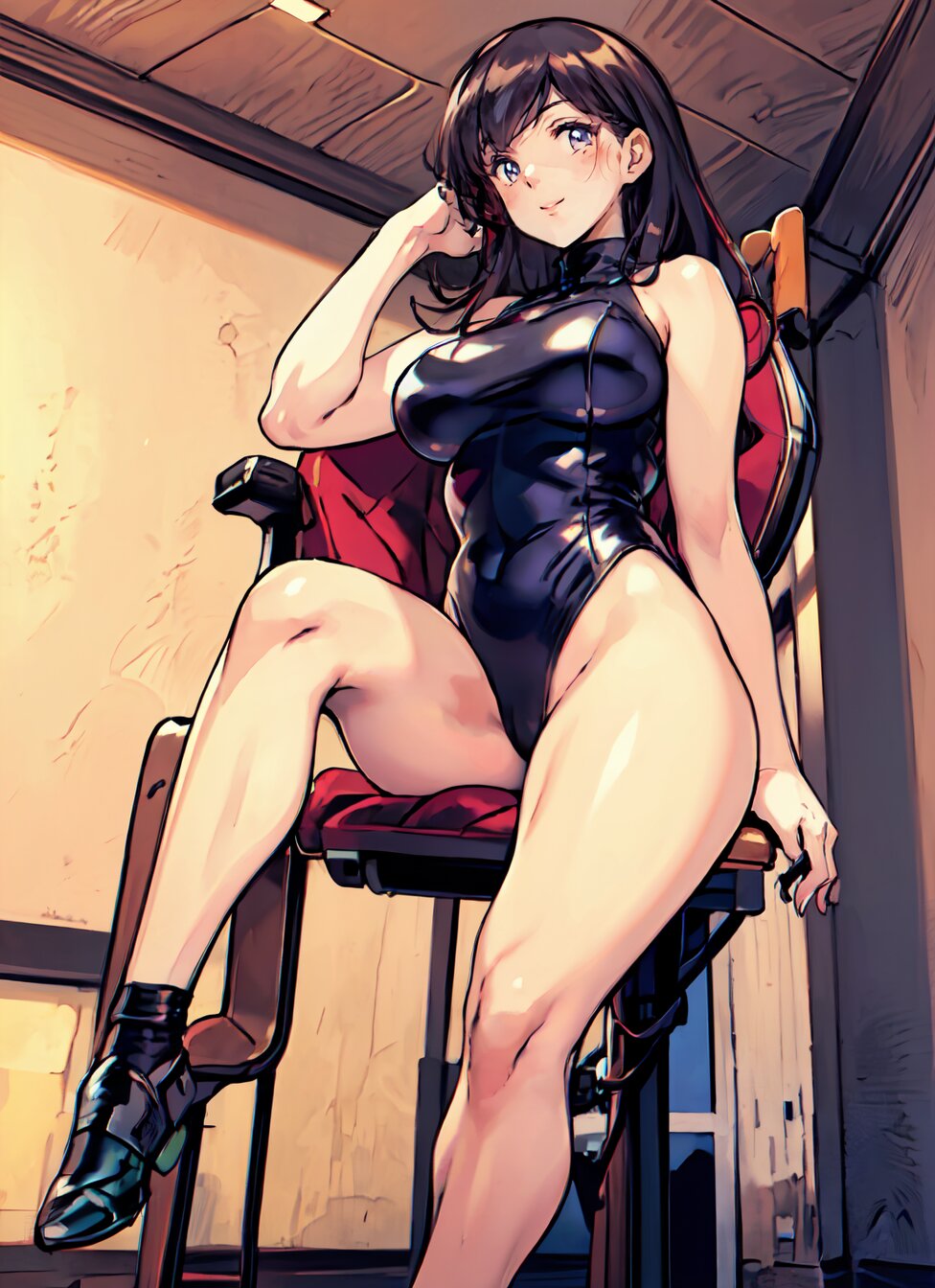 (8k, best quality, masterpiece:1.4), (realistic, photo-realistic:1.6), HDR, (incredibly absurdres:1.2), (vibrant color:1.2), ultra-detailed, (random pose, from below: 1.6), 1girl, solo, 22 years old, (chubby, huge breasts: 1.4), black long hair, (close up face: 1.2), perfect body, highly detailed, shiny skin, shiny hair, looking at viewer, (sexy Plunge leotard: 1.4), (sitting on chair, a leg up: 1.8), in the GYM, <lora:Oto_v01:0.8>