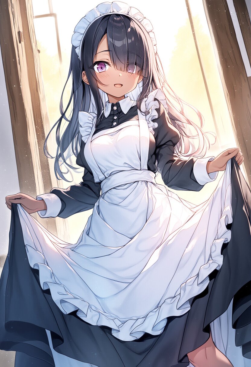 (traditional media:1.5),(sepia:1.8),masterpiece,best quality,ultra detailed,girl,{tall stature},large breasts,skinny,black hair,hair over one eye,{{straight hair}},long hair,{{dark skin}},sister,turime,purple eyes,classic maid,maid apron,long skirt,headdress,light smile,standing,curtsey,dynamic angle, no text, best quality, very aesthetic, absurdres