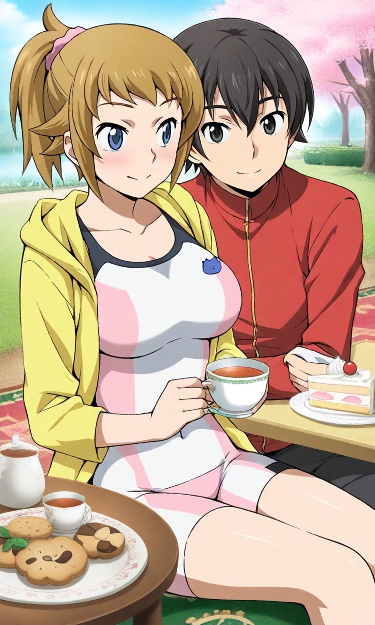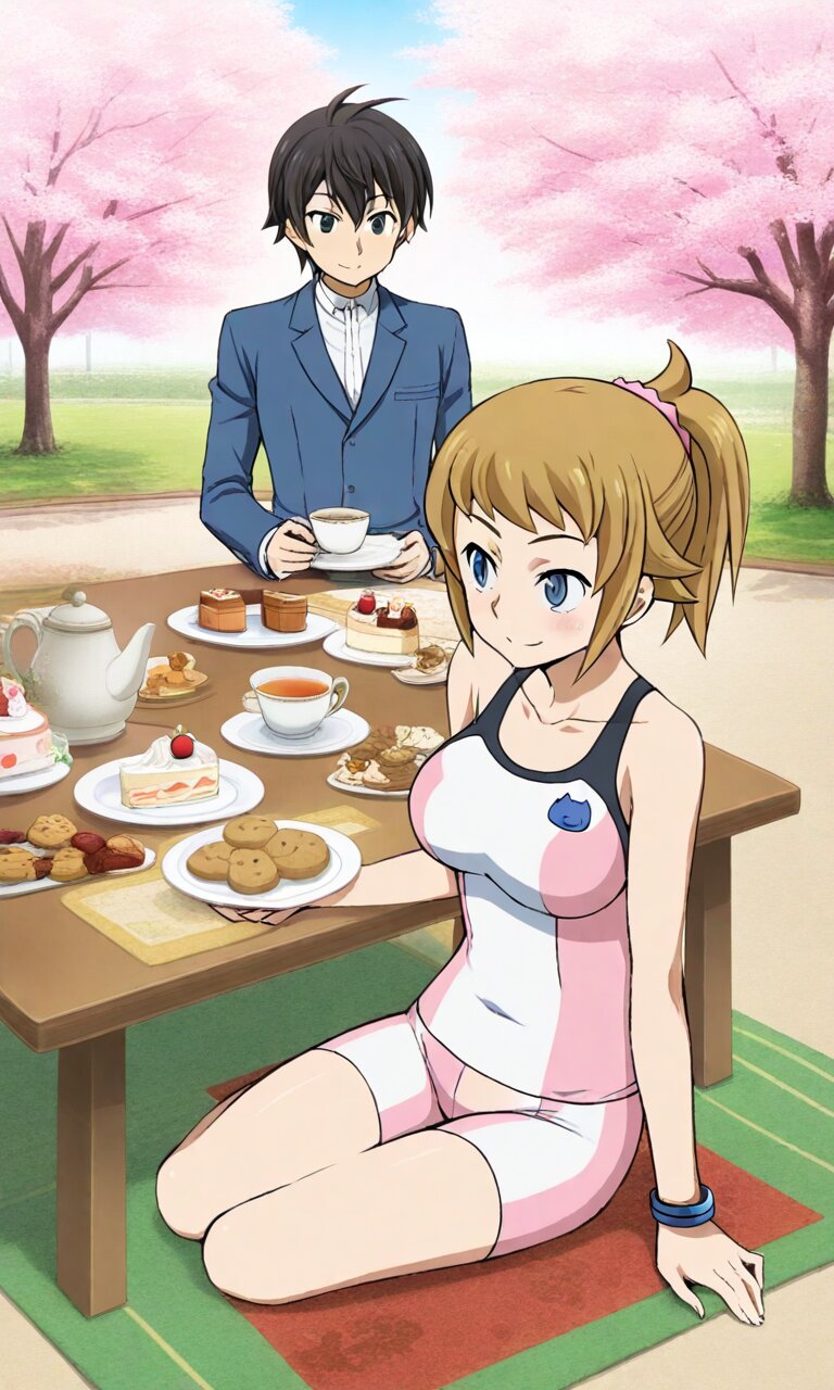 Couple, boy and girl, two people only,absurdres, ultra-detailed, master piece, high resolution, 8k, Boy, girl, two people, Spring, cherry blossom, tea time, table, herb tea, cookie, cake, cherry blossom carpet, cherry blossom tree BREAK the boy(original boy,black hair,short hair, black eyes) BREAK the girl(1girl, solo, hoshino fumina, brown hair, short hair, hair scrunchie, pink scrunchie, ponytail, blue eyes, large_breasts, ),