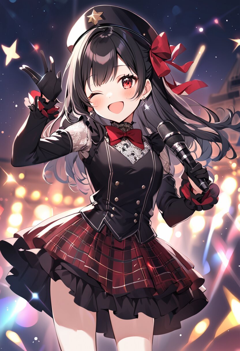 1girl, solo, 15years old, long hair, black hair, deep red eyes, pale skin, earring, hair ribbon, jewelry, long sleeves, flare sleeve, white lace blouse, black plaid dress, cabaret mini dress, party dress, cute, stylish, super mini, a-line, ruffle, high neck, (ribbon on neck), black police hat, deep red bowtie, black capelet, black headwear, black gloves, brown boots, ((blush)), holding microphone, one eye closed, smile, open mouth, at night, sky,