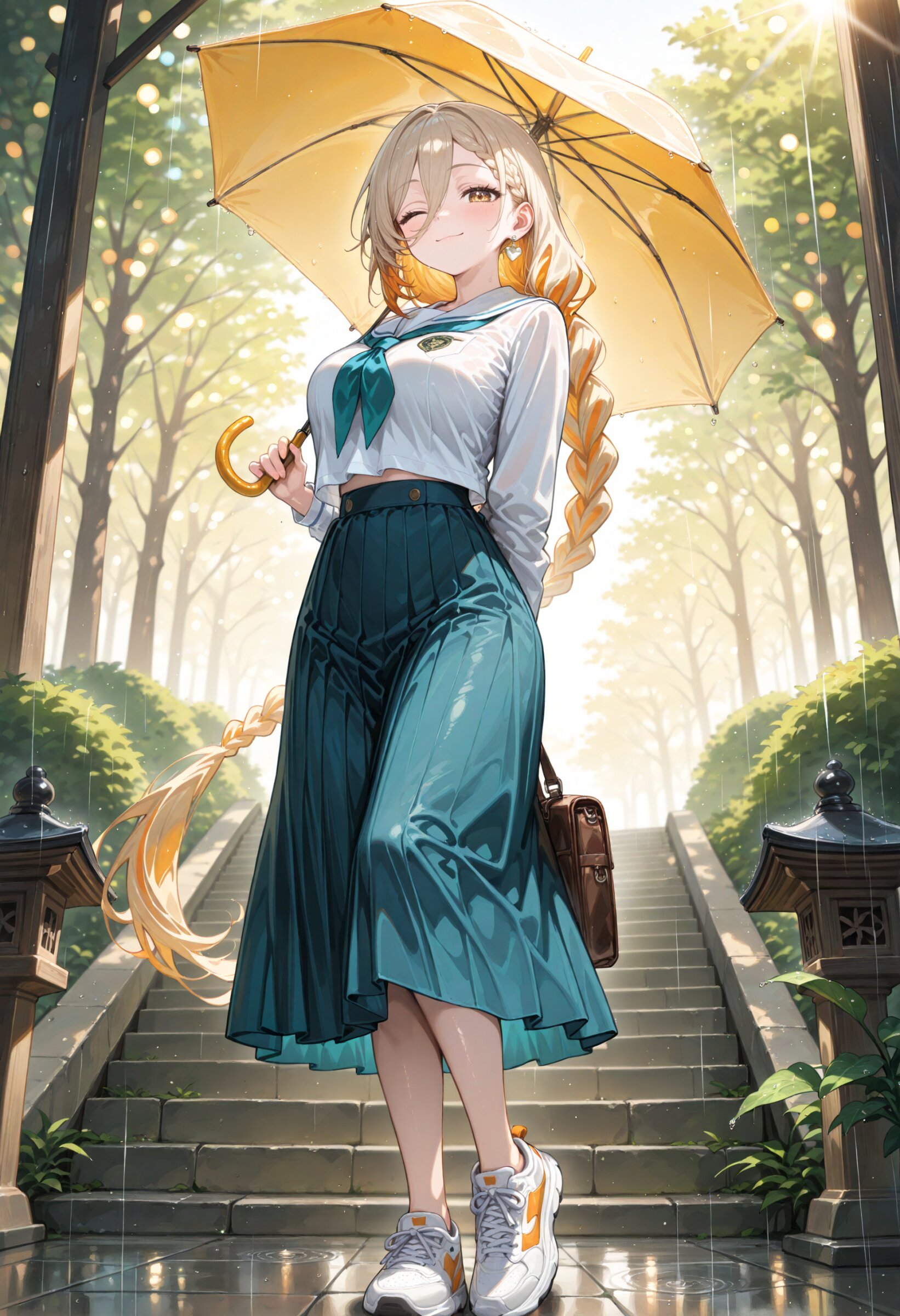 Over the Shoulder Shot, looking back (upper body:1.0) from below, looking down looking at viewer, Line art is drawn in a warm brown tone instead of black. The outlines have a soft, earthy feel, adding a gentle and nostalgic atmosphere to the illustration. 1girl, beautiful detailed eyes, cute face, cool, pale skin, skindentation, beautiful burnt sienna eyes, , , multicolored hair, platinum blonde hair, platinum blonde and brown and chartreuse yellow hair cute, absurdly long hair, french braided ponytail long bangs , Smooth and silky hair, first-rate female body perfect body beautiful large breasts, smart hips,, warm comfy humble expression, modest, unassuming, unpretentious action and one eye closed and light smile, seductive smile bisque school uniform, neckerchief, long sleeves, long plated skirt, , sneakers , a school bag (soft smile:1.0), depth of field, bokeh, An anime-style morning scene with a stone-paved sidewalk next to a lush green slope. At the top of the stone steps stands a small shrine and a sacred altar.,, spring sunlight, morning, sunshine, direct lighting, spring morning, rain, wind, holding umbrella arms behind back, standing (simple light bisque background:1.0) masterpiece, best quality, amazing quality, very aesthetic, absurdres, you can add scenery, (volumetric lighting), To make the background more distinctive. professional art lots of details, , overexposure, shiny-glistening, (watercolor style:0.0), (pastel color style:1.0) <lora:noline (1):-0.5> <lora:sdxl2-flat2-512b:-1.0> <lora:facelightup_xl_v10:0.5>