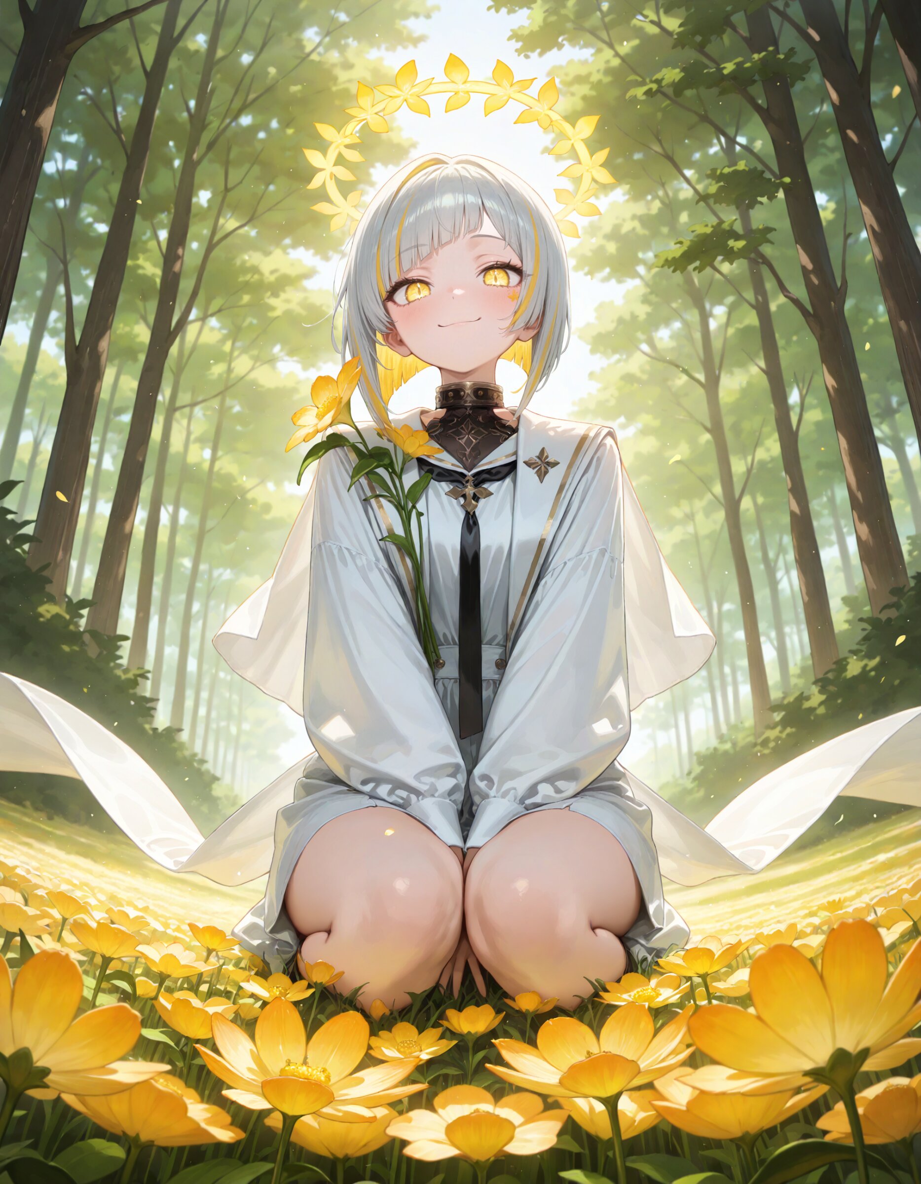 Over the Shoulder Shot, looking back (close to viewer:1.1), knees out of frame from below, looking down looking at viewer, paper background, watercolor \(medium\), 1girl, ((inverted bob)), (((detailed anime face))),((beautiful detailed face)), gray hair, ((colorful hair)),((streaked hair)), beautiful citrine eyes,(citrine eyes:1.3), multiple-colored hair, (colorful hair:1.4), cute face, sparking eyes, eye shadow,, flower halo, collar, white cloth, (extremely delicate and beautiful fabric), detailed clothes,, flower in mouth, cool, angel smile haughty face smile (emotional:1.1), (mad smile:1.0),(closed mouth:1.1), (Lilium grayi:1.1), (surrounded by Lilium grayi:1.0), Lilium grayi petals, in forest, flower field, (high saturation:1.0), v arms on back underlighting, super fine concept art, hard surface, 8K, unreal engine, masterpiece, best quality, amazing quality, very aesthetic, absurdres, newest, you can add scenery, (volumetric lighting), To make the background more distinctive. professional art lots of details, , overexposure,