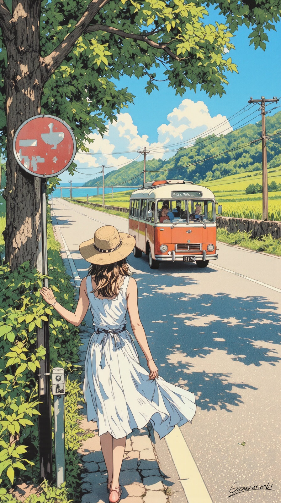夏色のバスが、まるで海の向こうから泳いでくるかのように近づいてくる