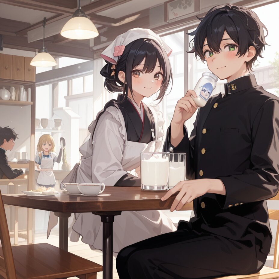 masterpiece, best quality, 1boy and 1girl, 1boy, child-faced, kawaii, college student, ((black Gakuran uniform)), men's black long trousers, sitting upright at a table, nervous, good finger, brake, 1girl, ((wearing a white apron)), kimono, black hair, waitress, smile, standing, serving 1cup of milk to the boy, in Milk Hall in the Taisho Era,