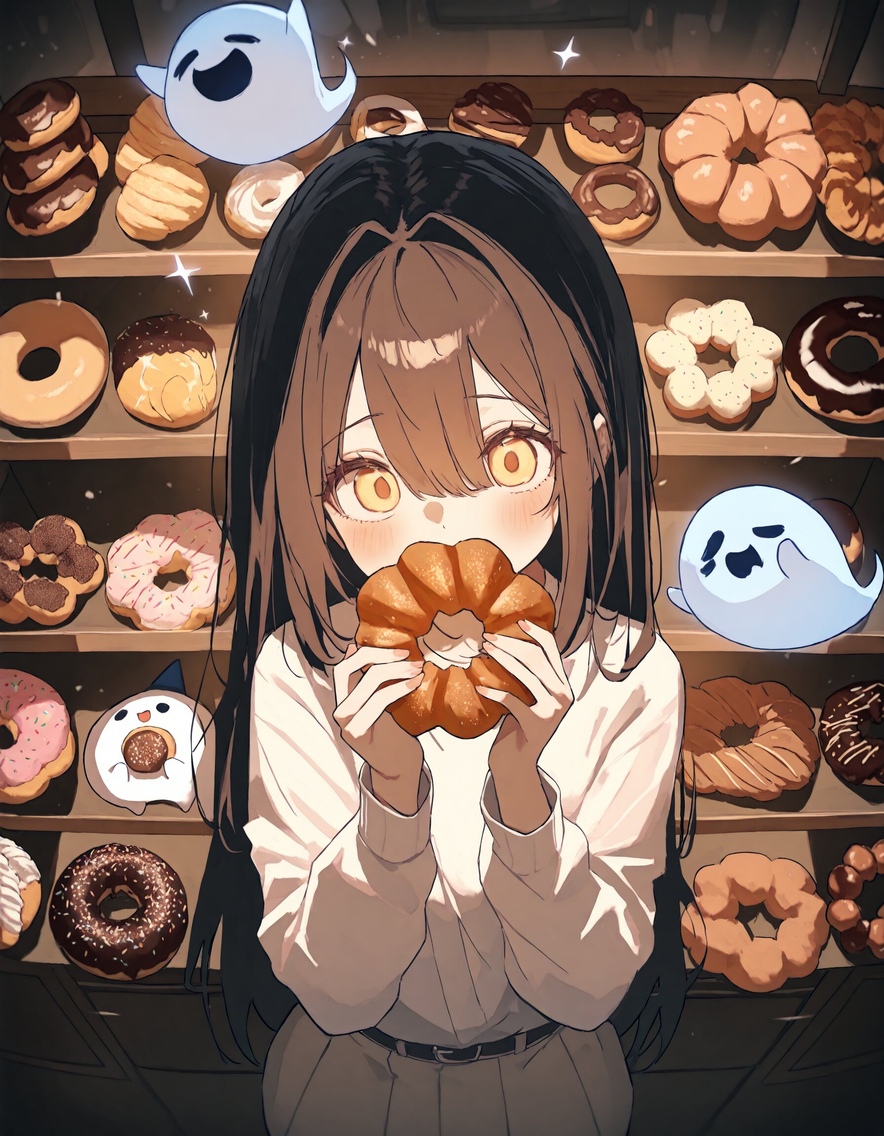 1girl, solo, ghost girl, cute ghost, funny ghost, indoor, doughnut, chocolate donut, french cruller, old-fashioned donut, pon de ring, masterpiece, great score, high score, absurdres