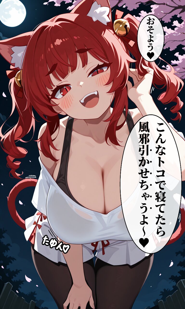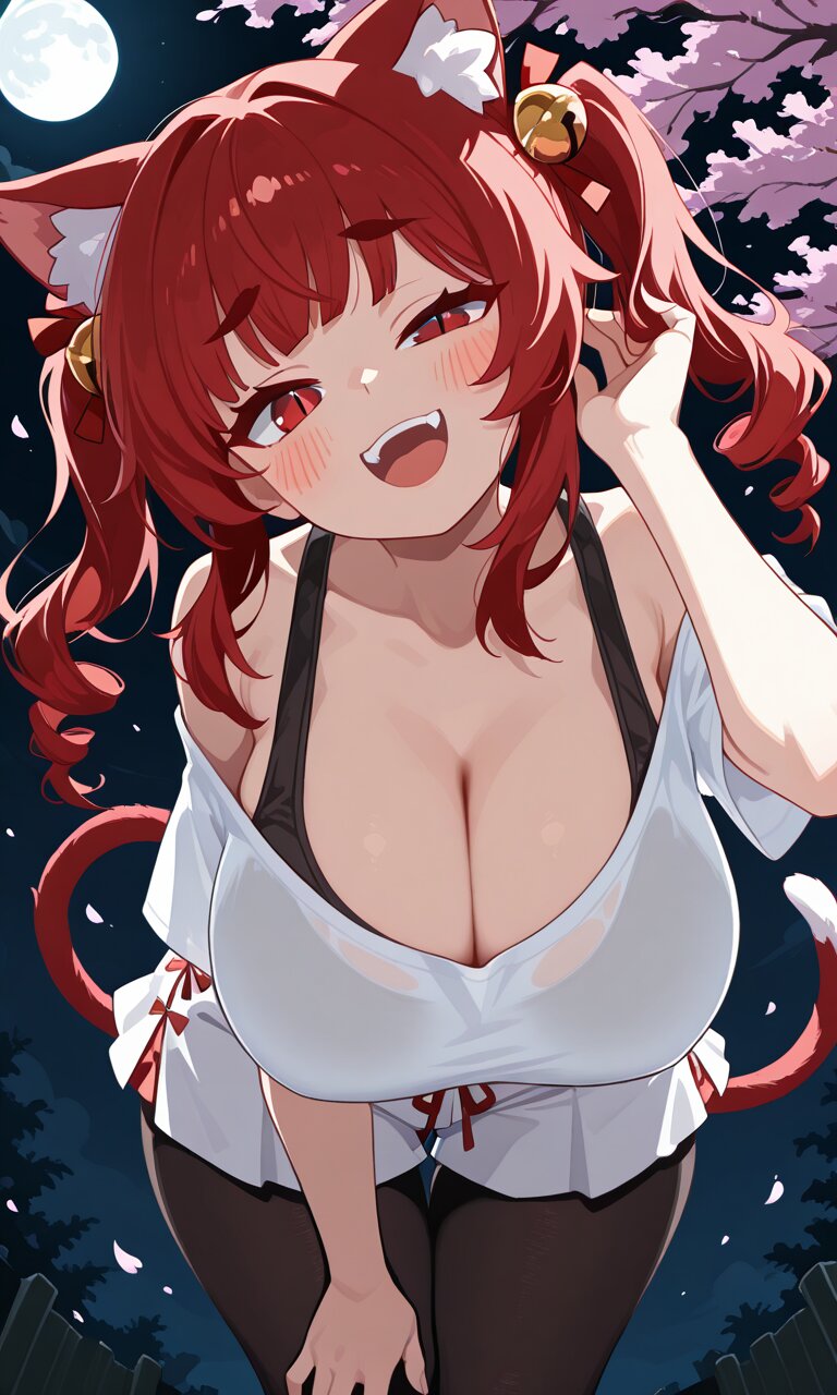 1girl,(nekomata),mesugaki,bitch brat,(huge breasts),emphasized deep breasts cleavage,narrow waist,(voluminous thick thighs),thigh gap,wide hips,long legs,red cat ears,red cat tail,two tails,raised inner eyebrows,jingle bell,hair bell,red ribbon,red hair,hime-cut,long twin drills,red eyes,tsurime,slit pupils,one eye closed,red eyebrows,black sports bra,sports bra thick shoulder straps,white cropped T-shirt over sports bra,off-shoulder T-shirt,simple T-shirt,v-neck,bare shoulders,frill-trimmed culottes,white culottes,black pantyhose,naughty,cheeky laughing,blush stickers,fangs,open mouth,one hand on own knee,hair flip,leaning forward,head tilt,floating hair,cherry blossom tree background,dark background,full moon,moonlight,(backlighting:1.2),body shade),hair shade,focus face,close-up face,from below,dutch angle,mesugaki,((high contrast)),(stylized),(kawaii),(anime coloring),(cute),mesugaki, smile, looking at viewer, blush,gddw,((correct_anatomy)),flat color, no lineart,Bright colors, Contour line, pale painting,,black pantyhose