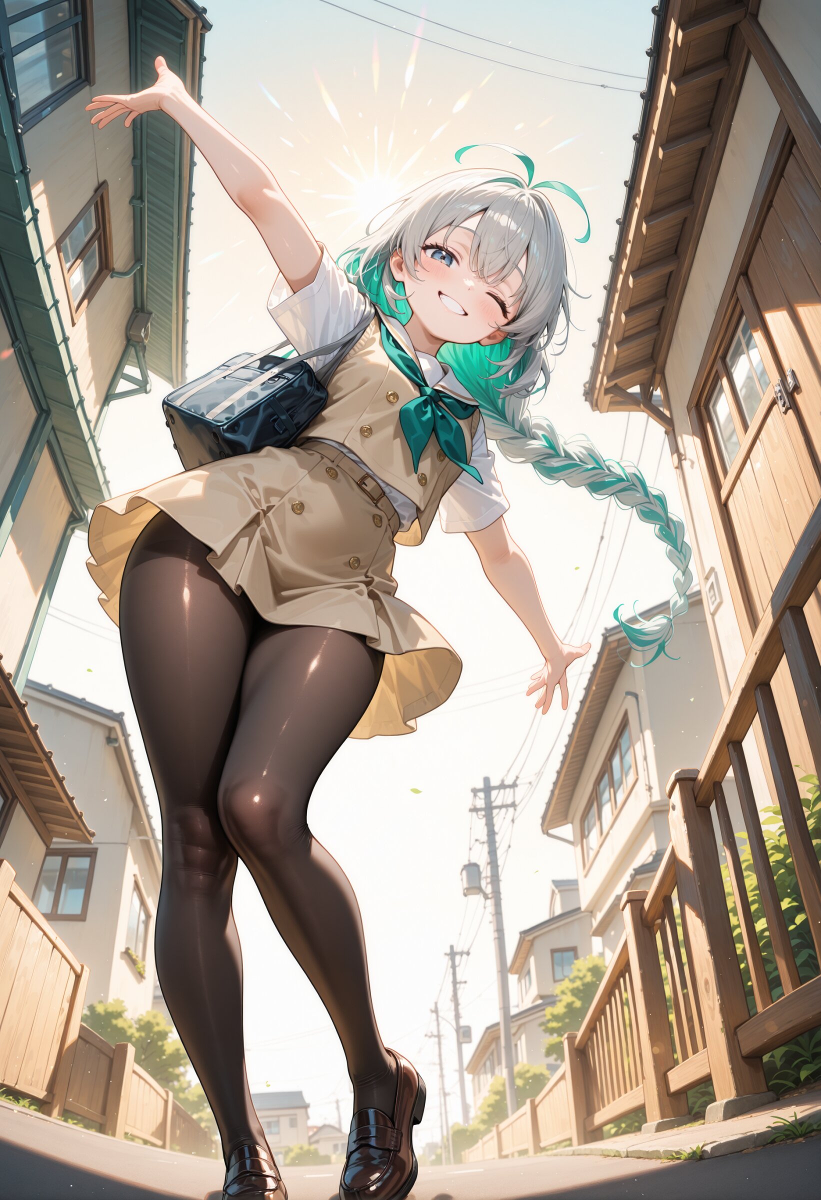 (fisheye,fisheye lens angle:1.0), (from below,looking down:1.1) looking at viewer, Line art is drawn in a warm brown tone instead of black. The outlines have a soft, earthy feel, adding a gentle and nostalgic atmosphere to the illustration. 1girl, beautiful detailed eyes, cute face, cool, redness skin, skindentation, beautiful slategray eyes, tareme , silver hair, green beige colored inner hair cute, extra long hair, braided ponytail hairline antenna hair shiny hair, first-rate female body perfect body beautiful small breasts, wide hips,, warm comfy (toothy grin:1.0) naughty face and thinking and one eye closed, seductive smile ivory school uniform, neckerchief, short sleeves,, short plated skirt, black pantyhose, loafers , a school bag (shy smile:1.2), depth of field, bokeh, school road, building, wooden fence, utility pole, ,, spring sunlight, morning, sunshine, direct lighting, spring morning, sunlight, morning, sunshine, light rays, spread arms, fleeing (gradient pastel color background:1.0) masterpiece, best quality, amazing quality, very aesthetic, absurdres, you can add scenery, (volumetric lighting), To make the background more distinctive. professional art lots of details, , overexposure, shiny-glistening, (watercolor style:0.0), (pastel color style:1.0) <lora:noline (1):-0.5> <lora:sdxl2-flat2-512b:-0.5> <lora:facelightup_xl_v10:0.5>