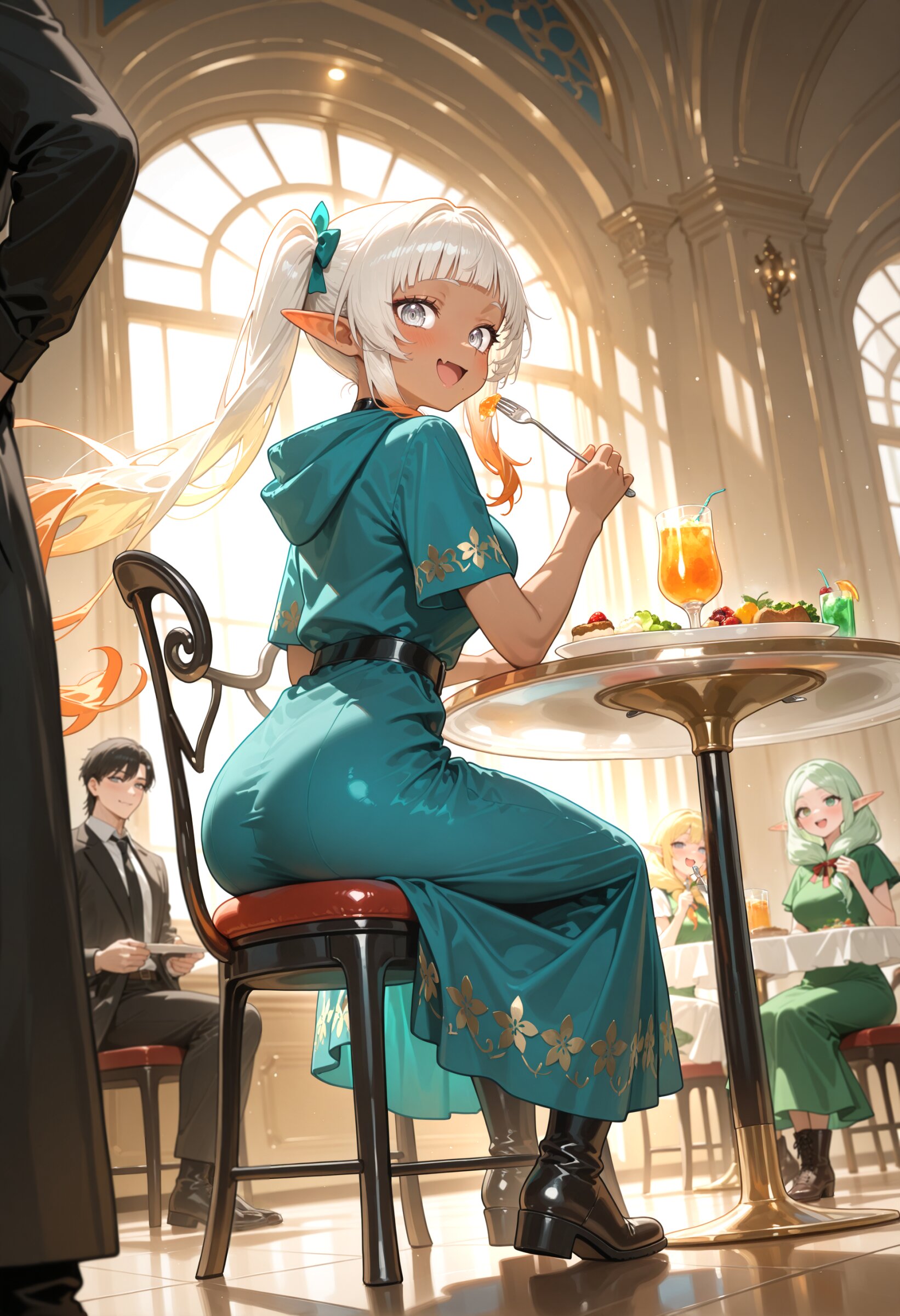 multiple girls, 4girls, (elf girls:1.2), , having a drinking party at a restaurant. (The restaurant's rooftop terrace offers breathtaking panoramic views of the medieval fantasy town:1.0). They are seated around a square table, drinking, chatting, and enjoying their food. Please show their joyous expressions and the sense of camaraderie between them, (noon:1.0), soft natural sunlight, (wide shot:1.1), from behind, looking back, from below, dutch angle, , perfect anatomy, with fork ,spoon, , eating risotto on plate, summer vegetable risotto on plate, , parfait with spoon, professional anime art lots of details, , overexposure, shiny-glistening, (watercolor style:0.7), (pastel color style:1.2) you can add scenery, (volumetric lighting), To make the background more distinctive. super fine concept art, hard surface, 8K, unreal engine, masterpiece, best quality, amazing quality, very aesthetic, absurdres, newest, ambient occlusion, raytracing, <lora:noline (1):-0.5> <lora:sdxl2-flat2-512b:0.15> <lora:facelightup_xl_v10:0.5> 文字数制限により省略