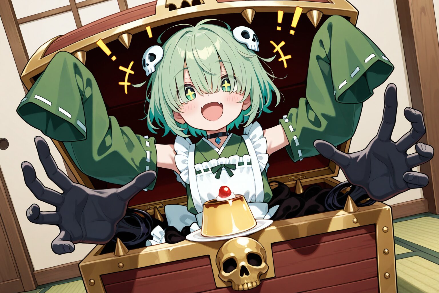 1 little girl, solo, diagonal angle, masterpiece, best quality, amazing quality, very aesthetic, cobalt green hair, short hair, messy hair, (hair over eyes:1.2), green eyes, demon fangs, +_+, open mouth, smile, cheerful, +++, notice lines, choker, green wa maid outfit, (oversized sleeves:1.2), detached sleeves, (floating black ghosty hands:1.2), skull hair ornament, in mimic chest, arms up, pudding, japanese room,