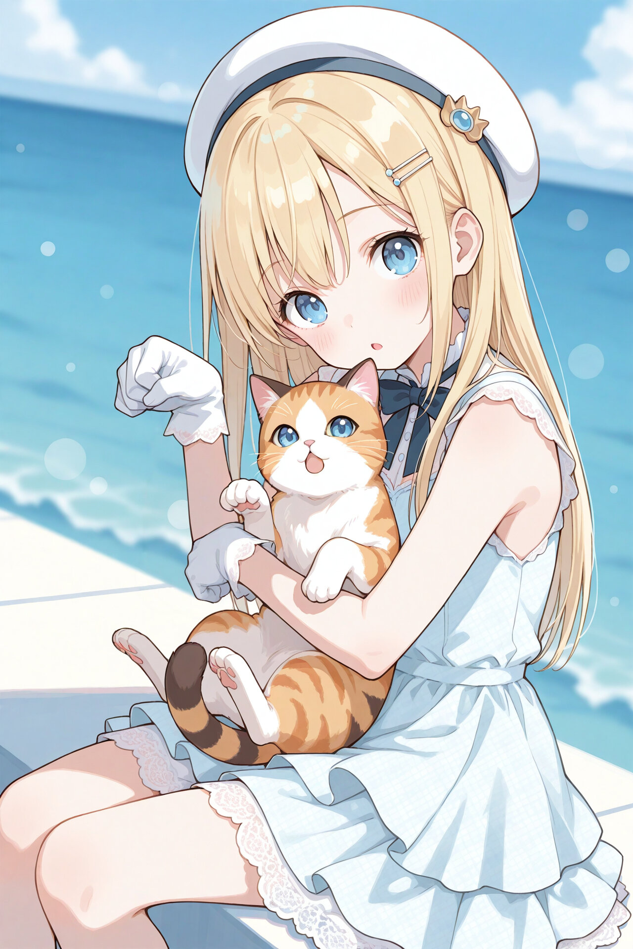 (flat color:0.1),(pale color:0.3), (tareme:0.33), cute 1girl, sitting, blue eyes, straight hair ,blond hair ,(hair between eyes:0.5), hairpin,kawaii, (pastel theme :0.5), (depth of field:1.1), (bokeh:0.8),:o, (head tilt:0.7),looking at viewer, BREAK (hugging a playful cat :1.33),paws up, correct anatomy, bowtie, beautiful , white gloves, hair ornament, (paw pose:1.2), outdoors, white hat, blurry background, sea, on deck ,refined dress, sleeveless_dress, unmoving pattern skirt, lace trim, (layered dress:1.1) , ( from side:0.2), ( dutch angle:0.1),(contrapposto:0.2),