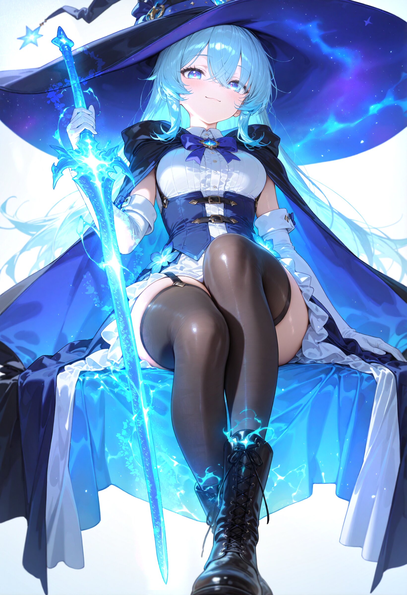 upper body, knees out of frame from below, looking down , 1girl, witch girl, blue eyes, beautiful iridescence eyes, beautiful detailed eyes, beautiful light blue hair, long bangs, long disheveled beautiful hair, first-rate female bodies, perfect body, beautiful breasts, framed breasts, cool face, (Beautiful Lips:0.7),, (stylish beautiful witch dress:1.2), white elbow gloves, (cute blue and dark blue witch girl costume:0.9), (white blouse:1.3), bow tie, witch long skirt (overskirt:1.1) black cloak, (blue galaxy witch hat:1.1), lace-up boots on feet, stockings and suspenders,, mysterious face, cool,significant smile , (transparent energy swirls around body:1.1), glowing magic sword, caustics, sitting, invisible chair, super fine concept art, hard surface, 8K, unreal engine, masterpiece, best quality, amazing quality, very aesthetic, absurdres you can add scenery, (volumetric lighting), To make the background more distinctive. professional art lots of details, , overexposure, shiny-glistening, (watercolor style:0.5), (pastel color style:0.5) <lora:noline (1):-0.5> <lora:sdxl2-flat2-512b:-1.0> <lora:facelightup_xl_v10:0.5>