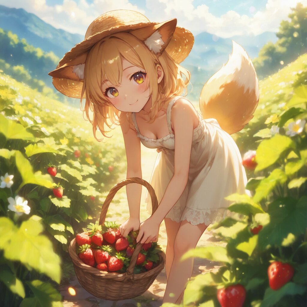 1girl,animal ear fluff,animal ears,strawberry (esp. the garden strawberry, fragaria x ananassa),bangs,bare shoulders,basket,berry,blonde hair,blue sky,blurry,blurry background,blurry foreground,blush,breasts,christmas tree,cleavage,cloud,cloudy sky,collarbone,day,depth of field,dress,extra ears,eyebrows visible through hair,field,flower,flower field,flower pot,food,fox girl,fox tail,fruit,garden,grass,hat,hibiscus,holding basket,leaning forward,lens flare,lily \(flower\),looking at viewer,motion blur,outdoors,plant,potted plant,rainbow,sky,sleeveless,sleeveless dress,smile,solo,squirrel tail,straw hat,sun hat,sundress,sunset,tail,strawberry,white dress,white flower,windmill,yellow flower,, appropriate posture,appropriate configuration,ideal ratio body proportions,perfect anatomy, <lora:Fixhands_anime_bdsqlsz_V1:1>, masterpiece, best quality, amazing quality, very aesthetic, absurdres, highres, newest