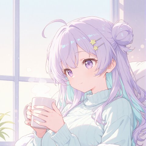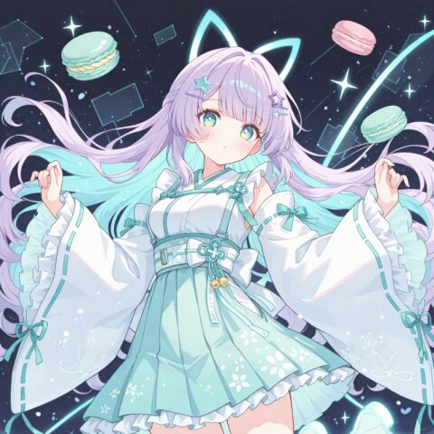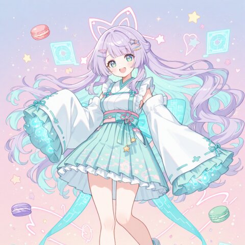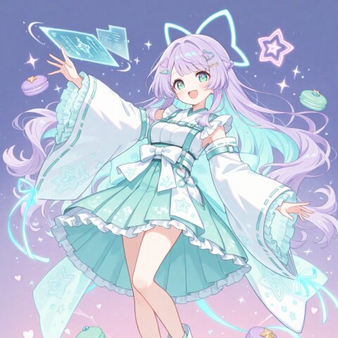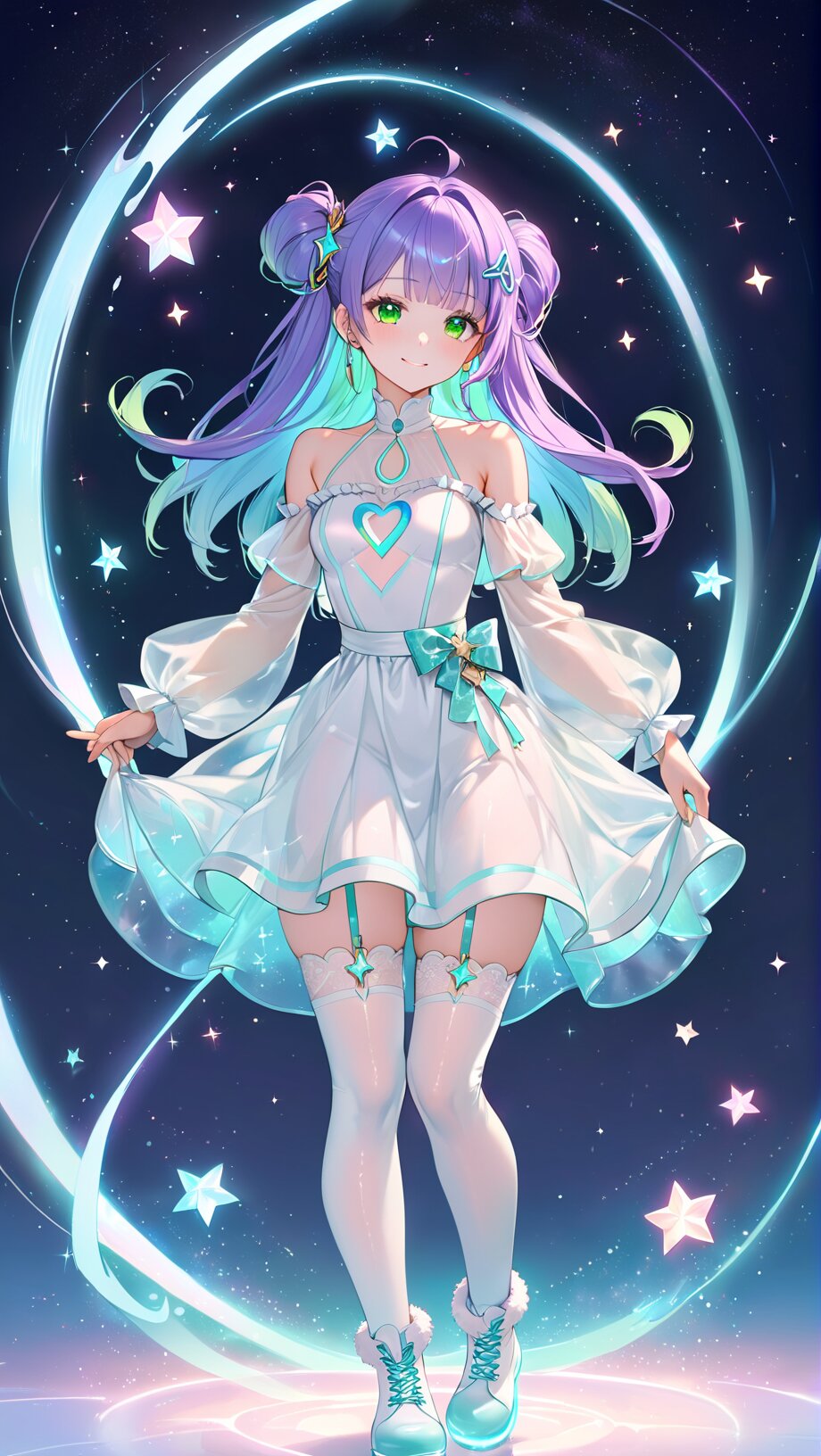 masterpiece, best quality, solo, full body, centered, beautiful anime girl, teenage, elegant futuristic idol outfit, soft white one-piece dress with glowing cyan circuit-like lines, short flare skirt with glowing geometric patterns, sheer off-shoulder top with transparent puffy sleeves, glowing accents along sleeves and chest, high neckline with light-blue glowing trim, bodysuit-style underlayer with luminous seams, straight long purple hair with vivid light blue inner color, silky hair texture, star-shaped hair clip, glowing ear cyber accessories, bright green eyes, soft and gentle smile, transparent ankle boots with light-blue glowing soles, thigh-high stockings with glowing light rings near the top, subtle holographic shimmer, glowing lines subtly pulsating across outfit, photorealistic anime style, soft pastel or white background, smooth shading, soft glow, futuristic and clean, pastel color palette, soft glow, sparkles, floating petals, fluffy textures, star motifs, heart motifs, translucent fabric, soft frills, magical atmosphere, gentle light, dreamy background, faint clouds, cute accessories, subtle rainbow tones