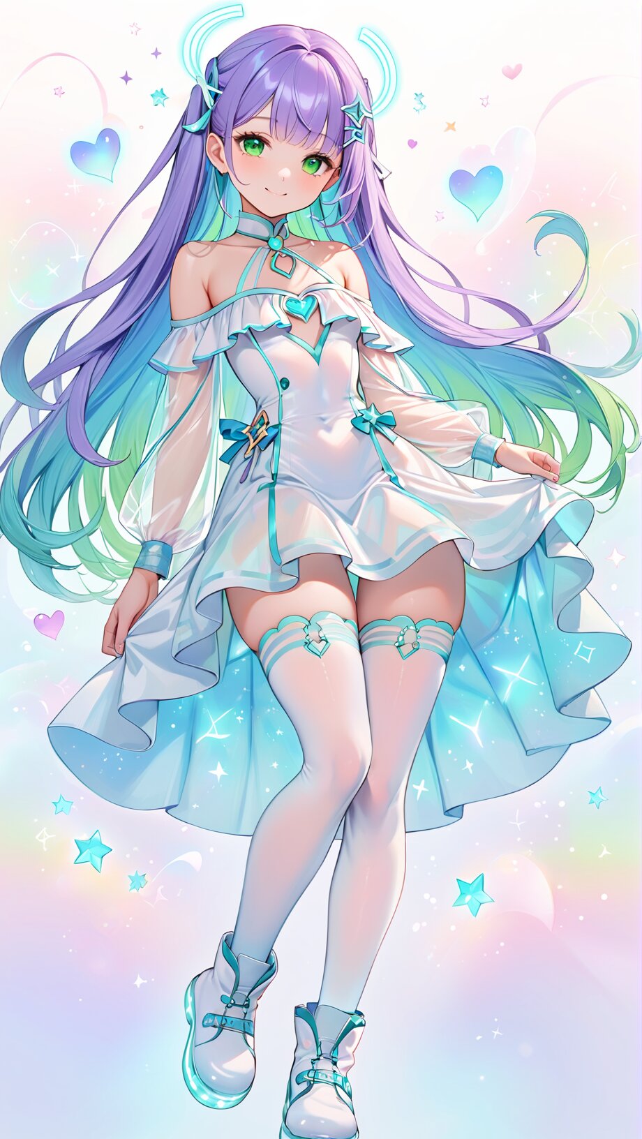 masterpiece, best quality, solo, full body, centered, beautiful anime girl, teenage, elegant futuristic idol outfit, soft white one-piece dress with glowing cyan circuit-like lines, short flare skirt with glowing geometric patterns, sheer off-shoulder top with transparent puffy sleeves, glowing accents along sleeves and chest, high neckline with light-blue glowing trim, bodysuit-style underlayer with luminous seams, straight long purple hair with vivid light blue inner color, silky hair texture, star-shaped hair clip, glowing ear cyber accessories, bright green eyes, soft and gentle smile, transparent ankle boots with light-blue glowing soles, thigh-high stockings with glowing light rings near the top, subtle holographic shimmer, glowing lines subtly pulsating across outfit, photorealistic anime style, soft pastel or white background, smooth shading, soft glow, futuristic and clean, pastel color palette, soft glow, sparkles, floating petals, fluffy textures, star motifs, heart motifs, translucent fabric, soft frills, magical atmosphere, gentle light, dreamy background, faint clouds, cute accessories, subtle rainbow tones