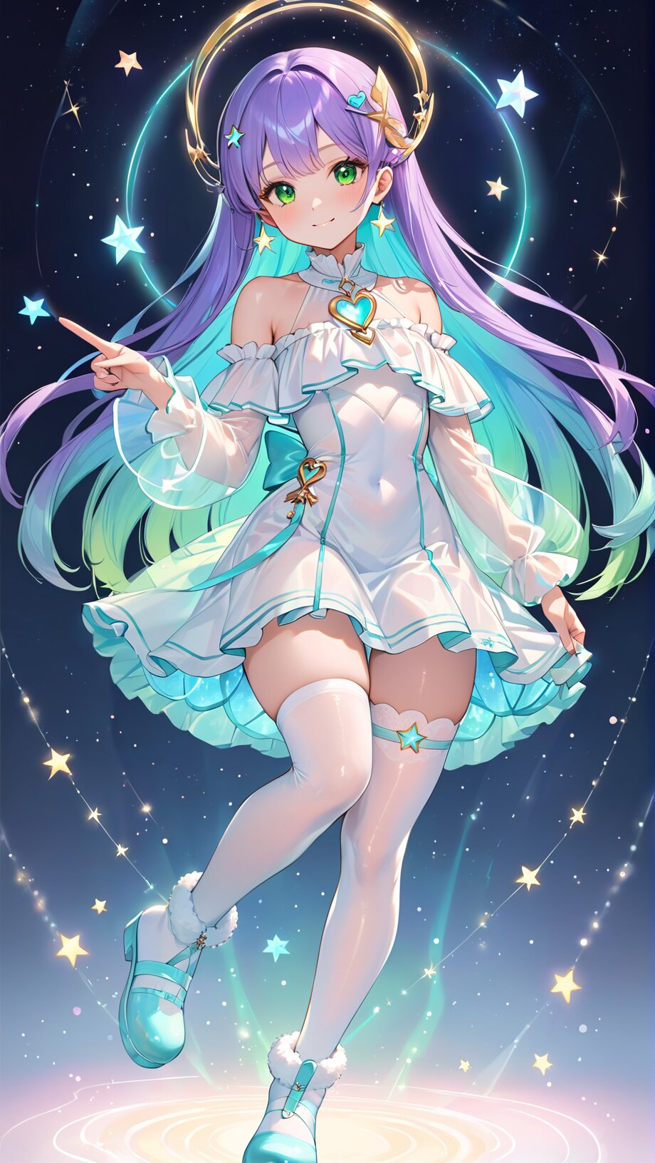 masterpiece, best quality, solo, full body, centered, beautiful anime girl, teenage, elegant futuristic idol outfit, soft white one-piece dress with glowing cyan circuit-like lines, short flare skirt with glowing geometric patterns, sheer off-shoulder top with transparent puffy sleeves, glowing accents along sleeves and chest, high neckline with light-blue glowing trim, bodysuit-style underlayer with luminous seams, straight long purple hair with vivid light blue inner color, silky hair texture, star-shaped hair clip, glowing ear cyber accessories, bright green eyes, soft and gentle smile, transparent ankle boots with light-blue glowing soles, thigh-high stockings with glowing light rings near the top, subtle holographic shimmer, glowing lines subtly pulsating across outfit, photorealistic anime style, soft pastel or white background, smooth shading, soft glow, futuristic and clean both hands gently held near chest, soft smile, slight head tilt, inward-pointing feet, modest and elegant posture, pastel color palette, soft glow, sparkles, floating petals, fluffy textures, star motifs, heart motifs, translucent fabric, soft frills, magical atmosphere, gentle light, dreamy background, faint clouds, cute accessories, subtle rainbow tones