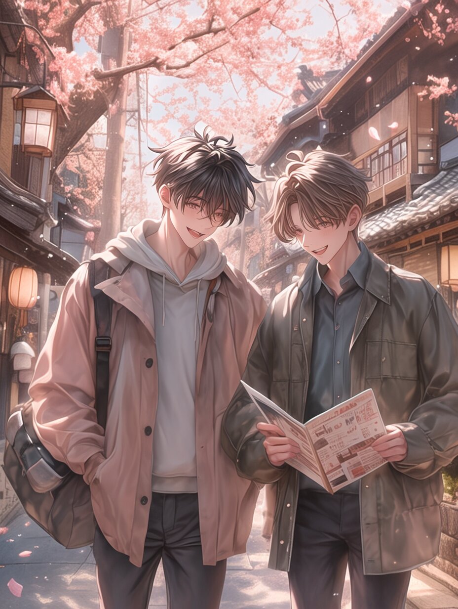 masterpiece, best quality, ultra-detailed, cinematic lighting, travel atmosphere, two young men walking side by side through a traditional Kyoto street, holding a tourist pamphlet together and smiling gently, one has short black hair and long eyelashes, the other has warm brown hair slightly tousled, both dressed in stylish casual spring outfits, behind them are wooden machiya townhouses, noren curtains, and tiled roofs with paper lanterns swaying softly in the breeze, cherry blossoms flutter in the background, and sunlight filters between the traditional buildings, casting soft shadows, the pamphlet they are holding shows a map and small pictures of Kyoto landmarks like Kiyomizu-dera and Arashiyama, they look relaxed and engaged, enjoying their journey, with light sparkles and warmth in the air, semi-realistic anime style, daytime warm tones, natural composition full of gentle movement
