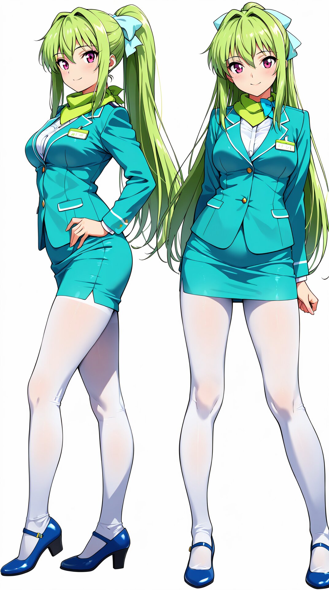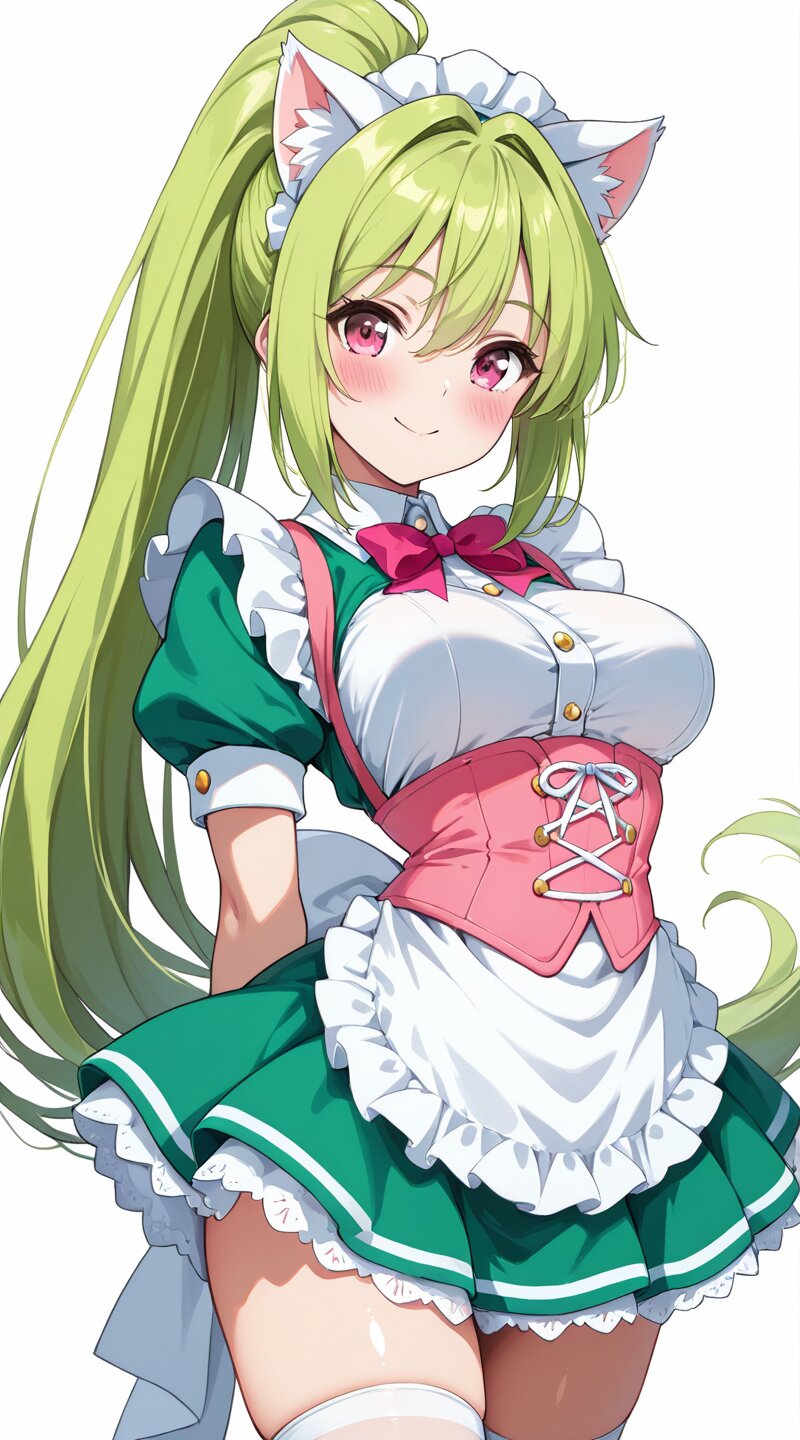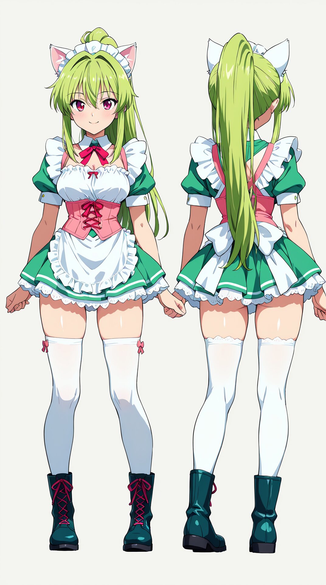 masterpiece,best quality, a beautiful anime girl,full body, detailed character sheet, simple background,white background,smile, (pastel lime green hair),(white cat ears), Very long hair,high ponytail,(hair intakes),bangs between eyes, (bright red-pink eyes), (tsurime:0.6), medium breasts, standing pose,soft lighting, a green maid outfit, with a white square collar, short puff sleeves, a white sheer frilly apron, mini skirt, white lace petticoat, bright red-pink corset-style waist, and a big white ribbon tied at the back,maid headdress, long white thigh-high socks, shiny black leather Lace-up boots, (keep thick outlines),preserve bold lines,