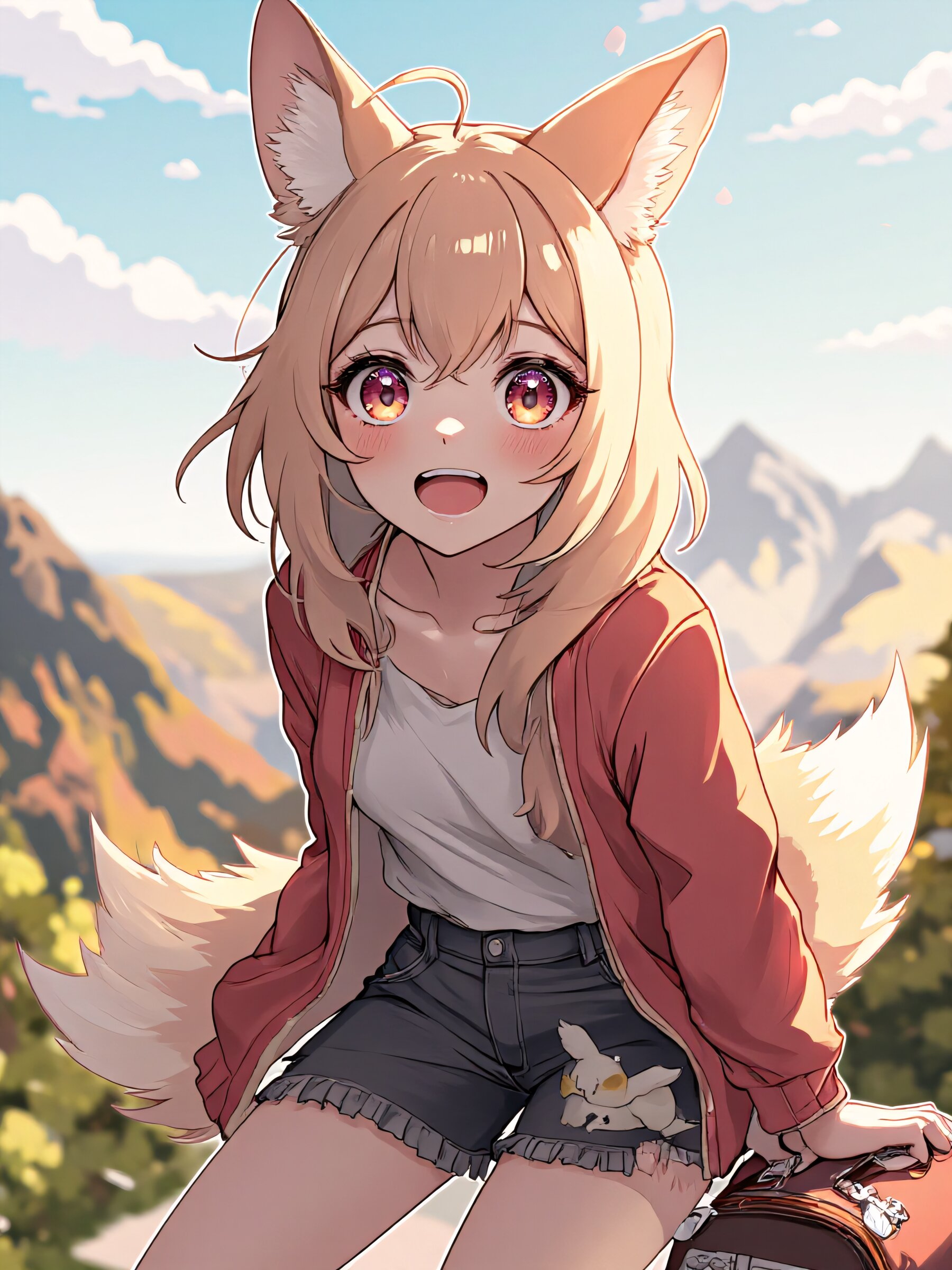 Anime style, full-body, fox-eared girl, light brown hair, fluffy fox tail, double eyelids, long eyelashes, large red eyes, casual outfit, travel setting, suitcase, scenic background, warm sunlight, excited expression, soft lighting, vibrant colors, dynamic pose, adventure atmosphere.