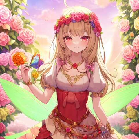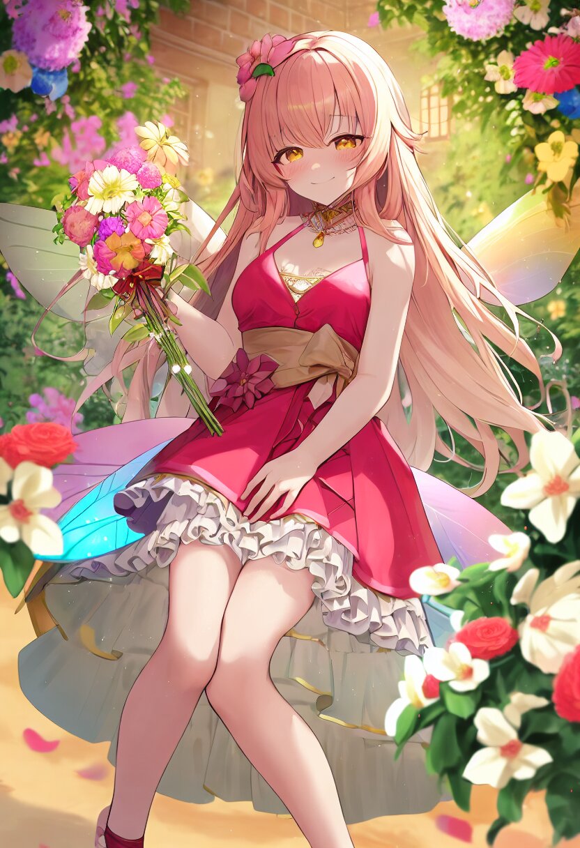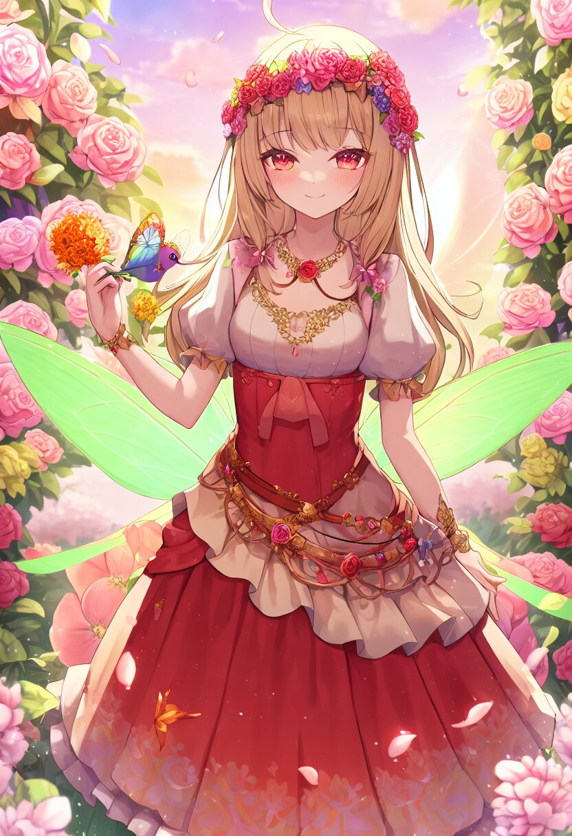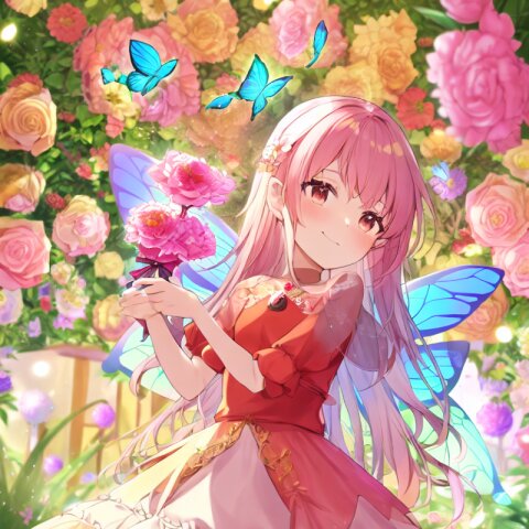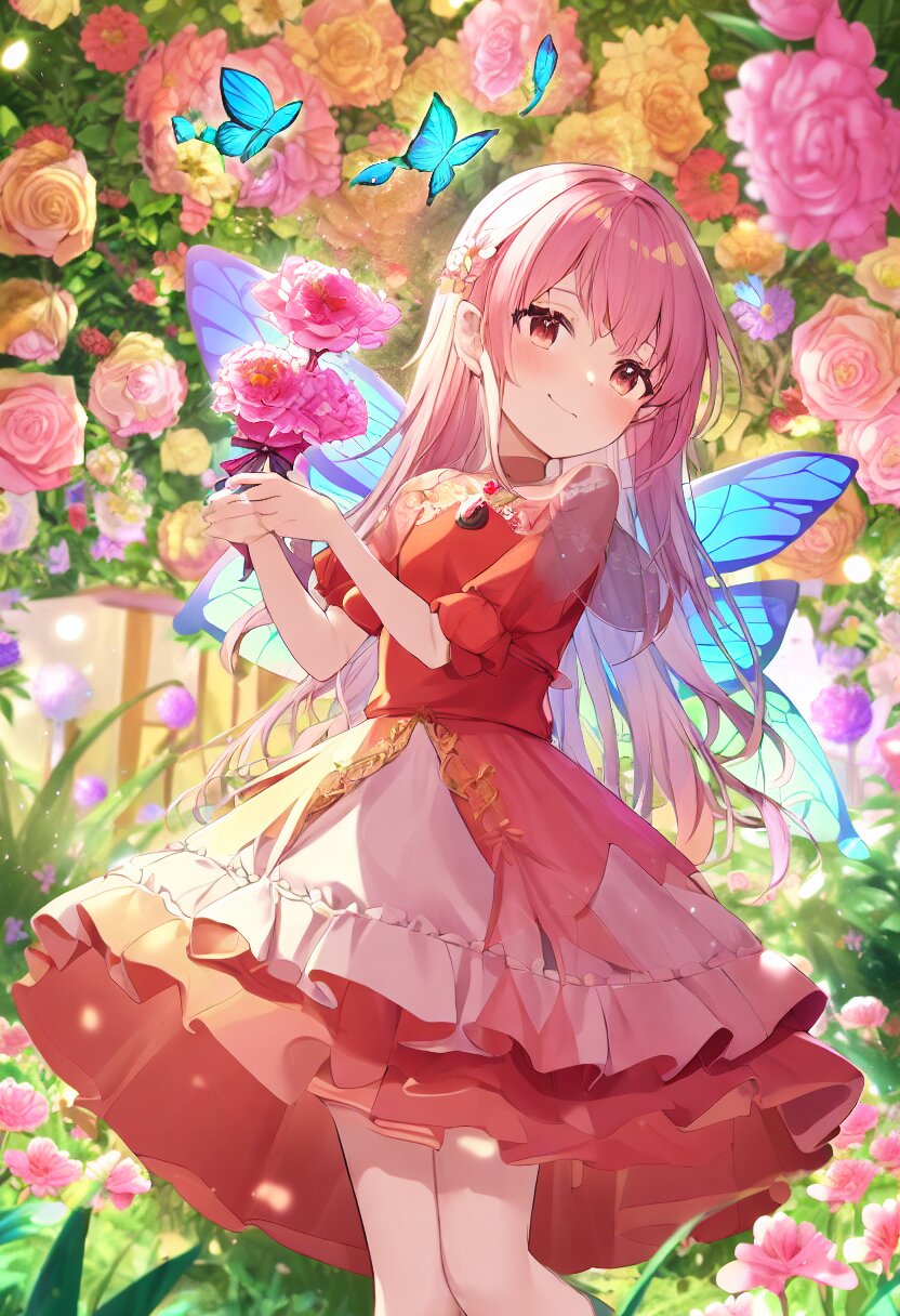 very aesthetic, best quality, absurdres, A charming girl in a red dress with a small fairy hovering above her stands in a garden filled with exotic flowers and colorful birds. Holding a glowing pink carnation, she gazes up in awe as butterfly wings subtly appear on her back, adding a magical aura. Downs float gently around her, blending perfectly with the soft fairy lights and vibrant flowers.
