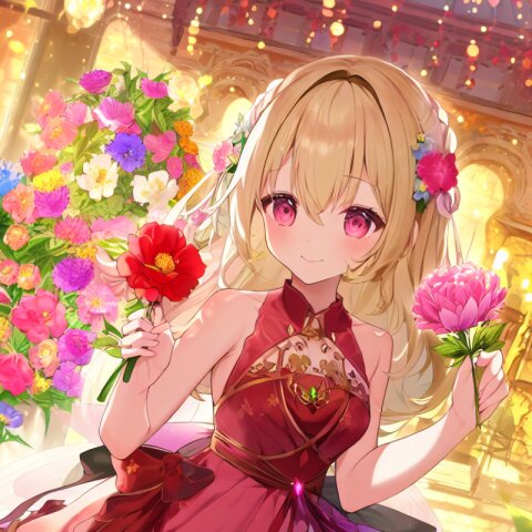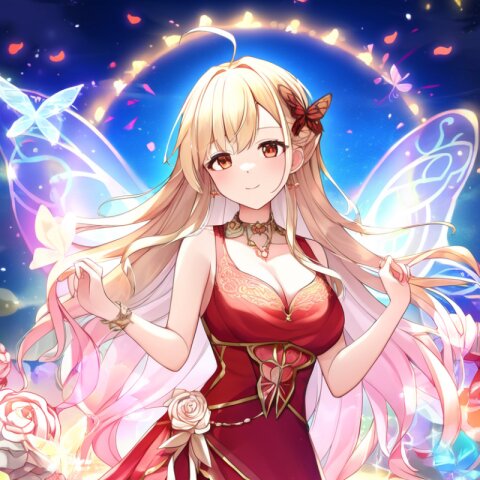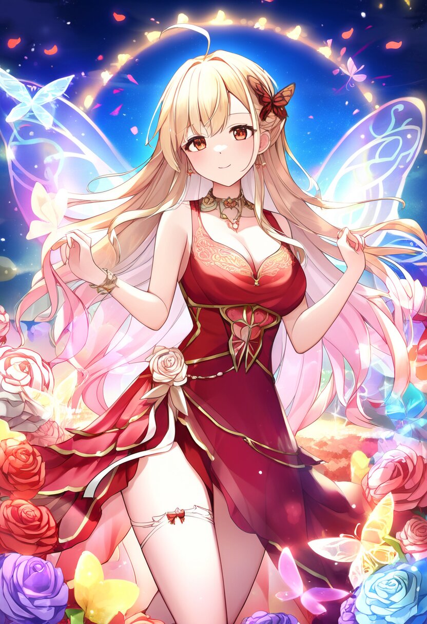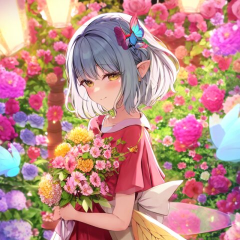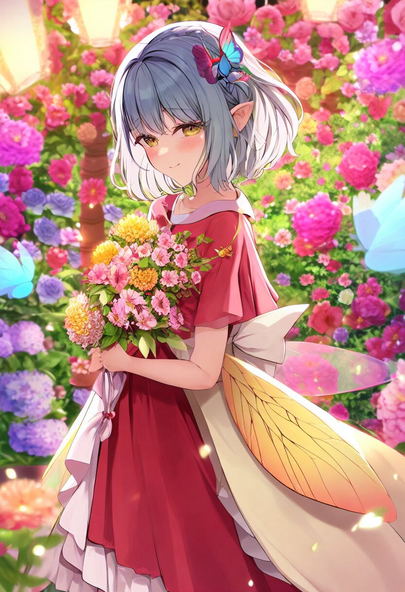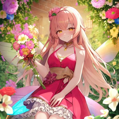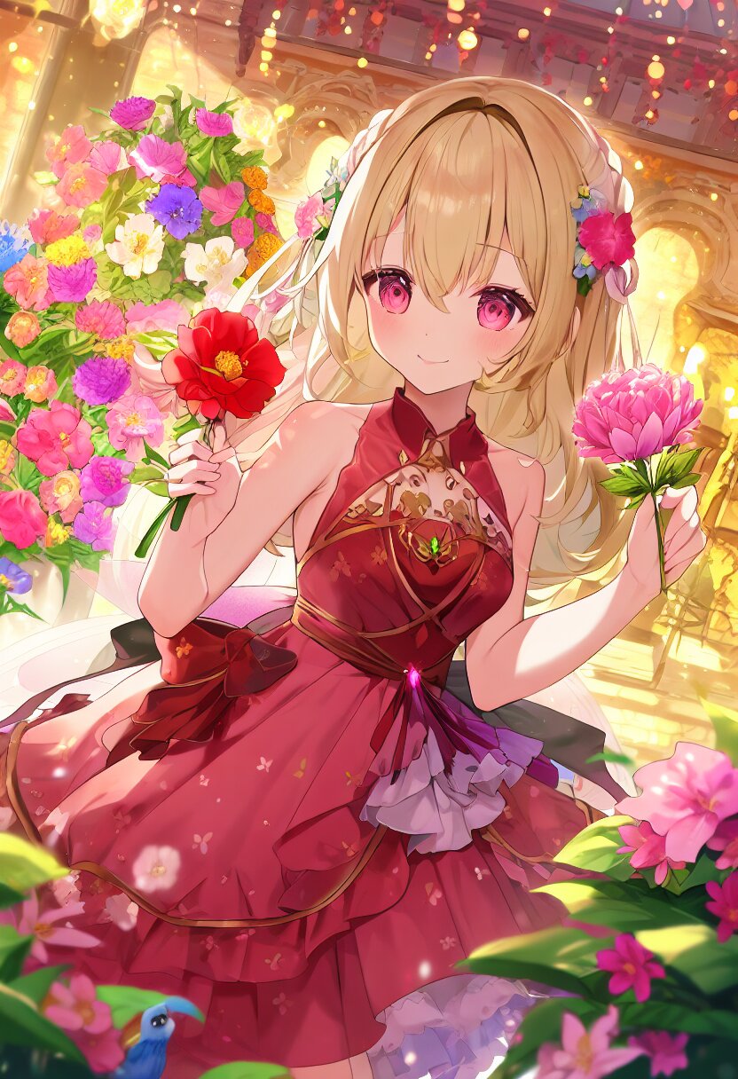 very aesthetic, best quality, absurdres, A charming girl in a red dress with a small fairy hovering above her stands in a garden filled with exotic flowers and colorful birds. Holding a glowing pink carnation, she gazes up in awe as butterfly wings subtly appear on her back, adding a magical aura. Downs float gently around her, blending perfectly with the soft fairy lights and vibrant flowers.