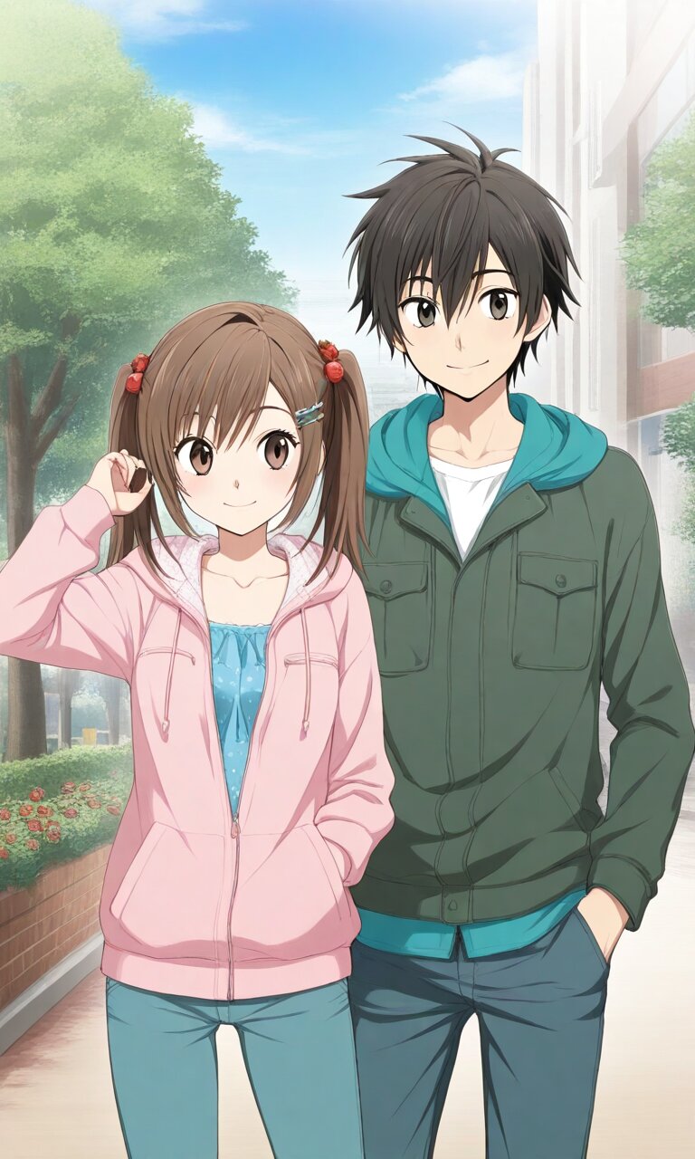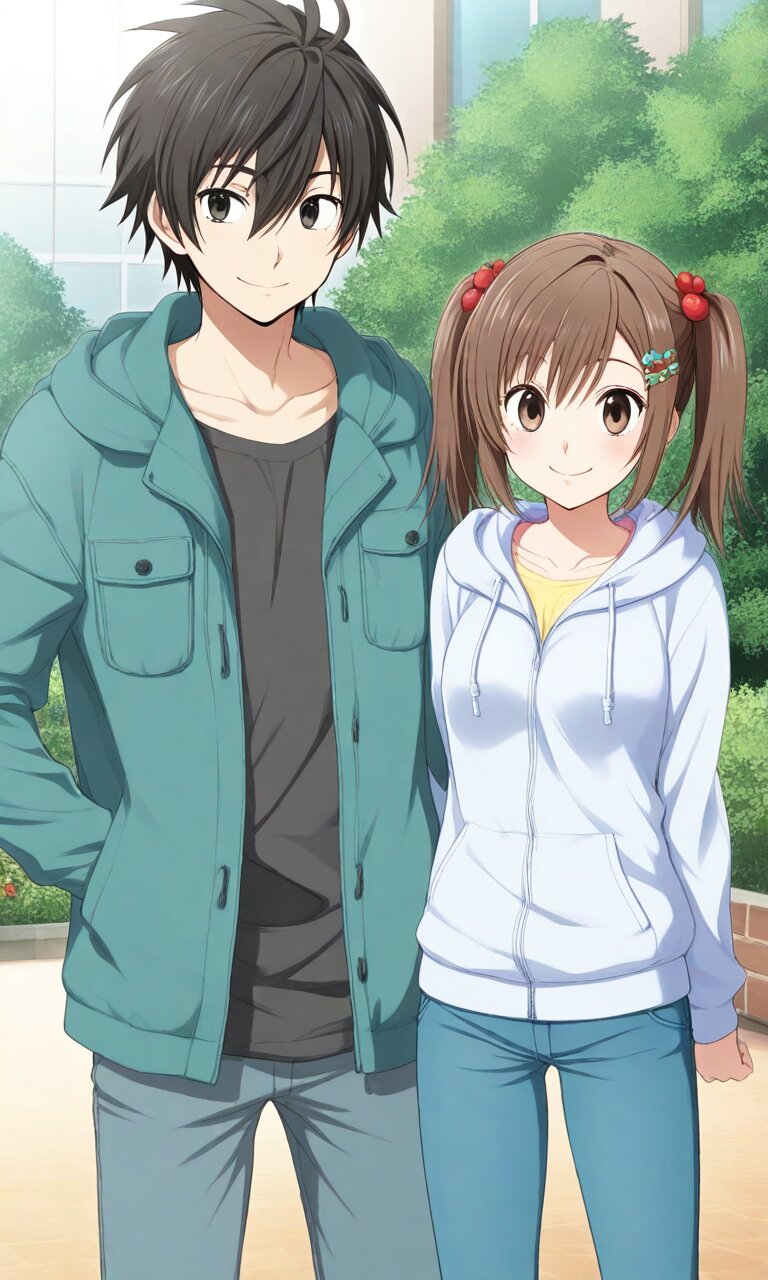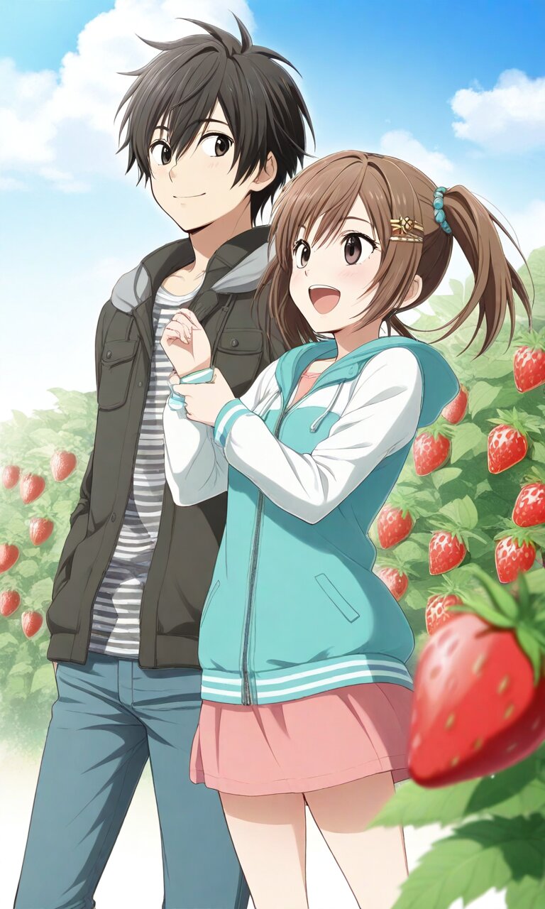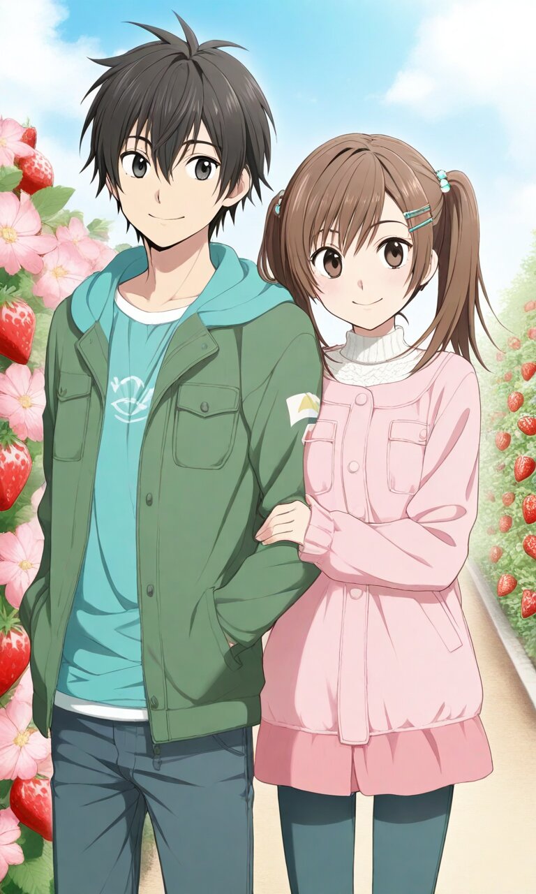 Couple, boy and girl, two people only,absurdres, ultra-detailed, master piece, high resolution, 8k, Boy, girl, couple,outside, Strawberry fields, strawberry rain, smiles, festivals BREAK Boy, long sleeved jacket, jeans, smiling BREAK Girl, smiling, BREAK the boy(original boy,black hair,black eyes) BREAK the girl(MISA3,1girl,brown hair,brown eyes,hair ornamen,twintails,),,