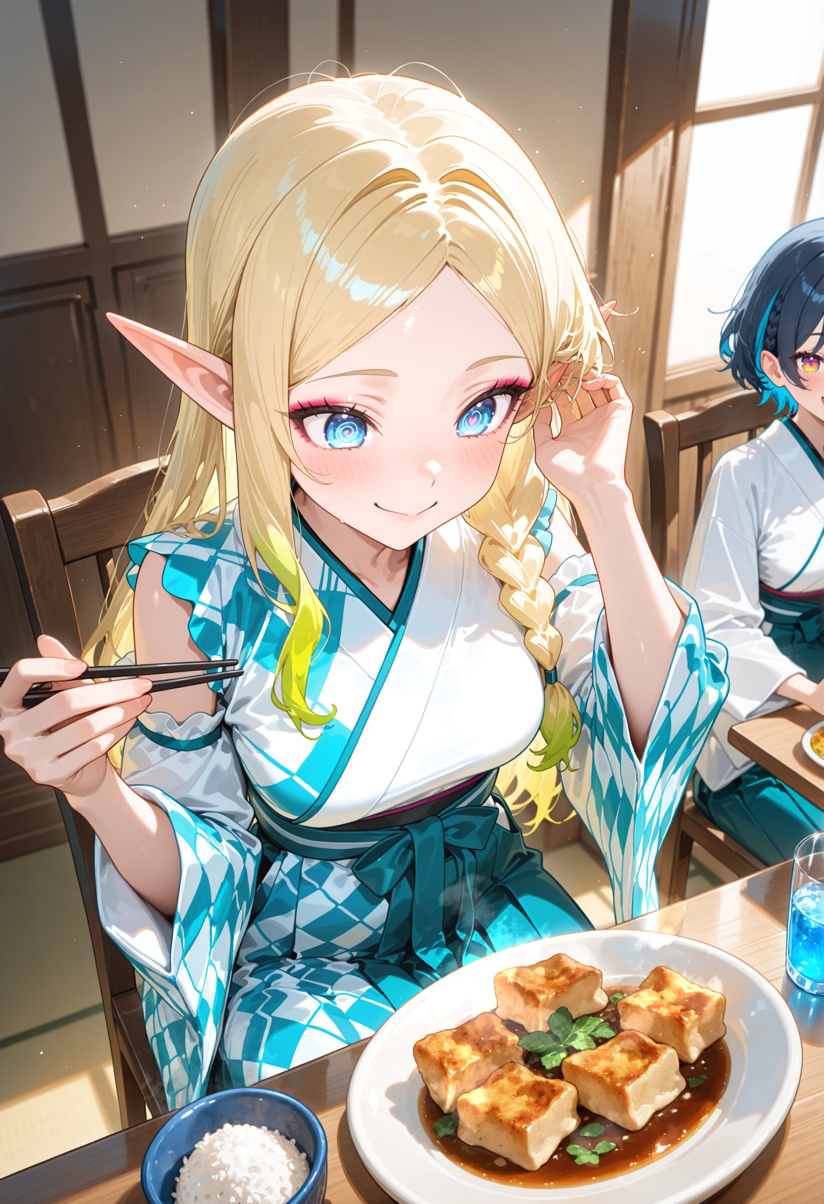 multiple girls, 2girls, (elf girls:1.2), , having a drinking party at a old japanese bar,. They are seated around a round table, drinking, chatting, and enjoying their food. Please show their joyous expressions and the sense of camaraderie between them, (noon:1.0), soft natural sunlight, (cowboy shot:1.1), , from above, dutch angle, , perfect anatomy, , with chopsticks, spoon, , eating rice bowl, deep-fried tofu on small plate, , sashimi on plate, professional anime art lots of details, , overexposure, shiny-glistening, (watercolor style:1.2), (pastel color style:1.2) you can add scenery, (volumetric lighting), To make the background more distinctive. super fine concept art, hard surface, 8K, unreal engine, masterpiece, best quality, amazing quality, very aesthetic, absurdres, newest, ambient occlusion, raytracing, <lora:noline (1):-0.5> <lora:sdxl2-flat2-512b:0.15> <lora:facelightup_xl_v10:0.5> 文字数制限により省略