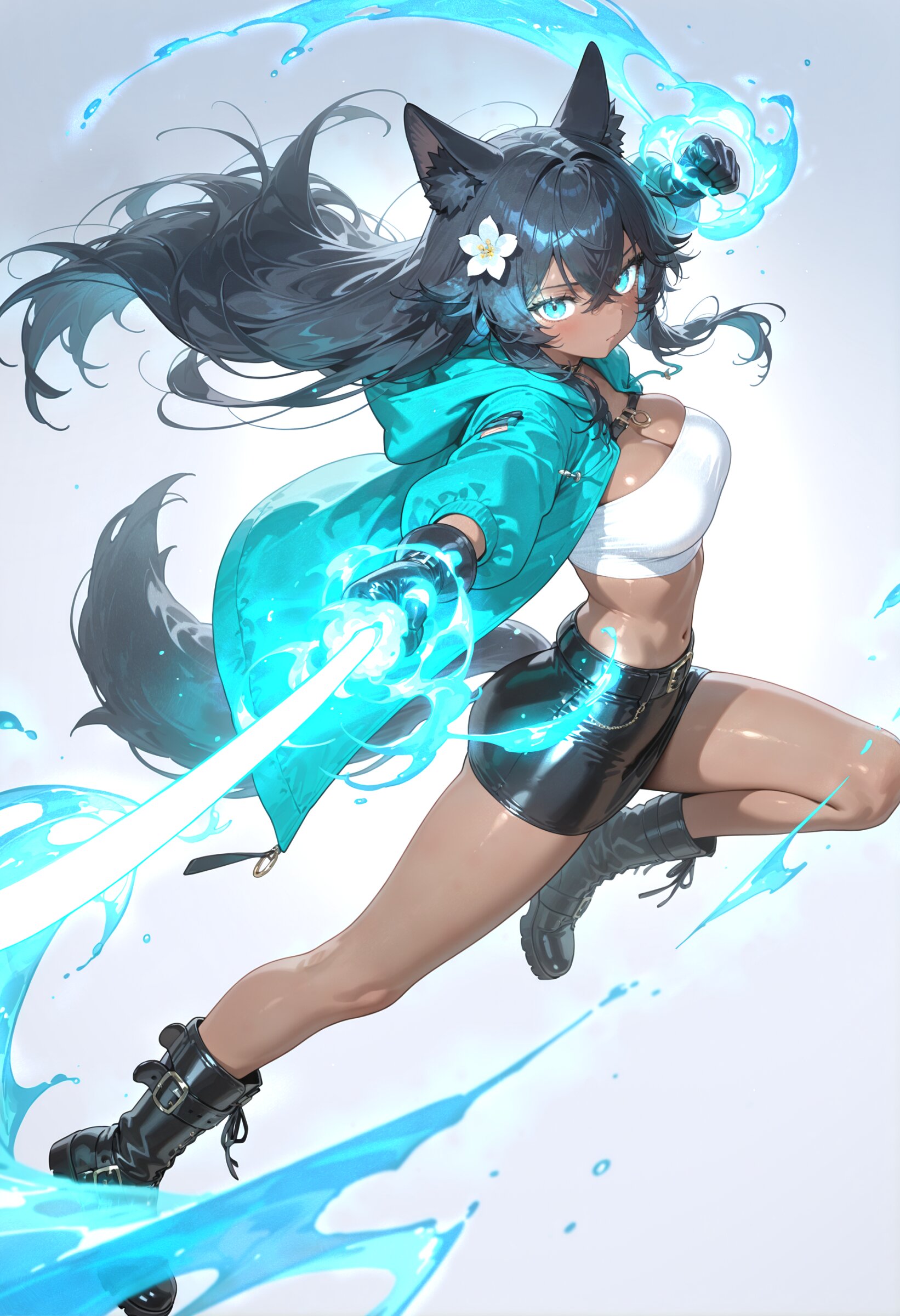 from side, looking at viewer , (simple background:1.2) 1girl, black wolf ears, dark skin, young beautiful girl, large breasts, tall, wolf tail, (aristocratic features), (Black Hair:1.2) (disheveled long hair over ears:1.3) messy hair ornament flower, (perfect turquoise eyes:1.3) long eyelashes,, wearing turquoise hood down and white tube top leather gloves, lether miniskirt, belt boots, turquoise hoodie, water magic, , dynamic pose, punching, (swirling energy,energy magic,energy:1.2), water magic, create water sword, great clear water, reflection focus, , 8K, unreal engine, masterpiece, best quality, amazing quality, very aesthetic, absurdres you can add scenery, (volumetric lighting), To make the background more distinctive. professional art lots of details, , overexposure, shiny-glistening, (watercolor style:1.0), (pastel color style:0.5) <lora:noline (1):-0.5> <lora:sdxl2-flat2-512b:-0.5> <lora:facelightup_xl_v10:0.5>