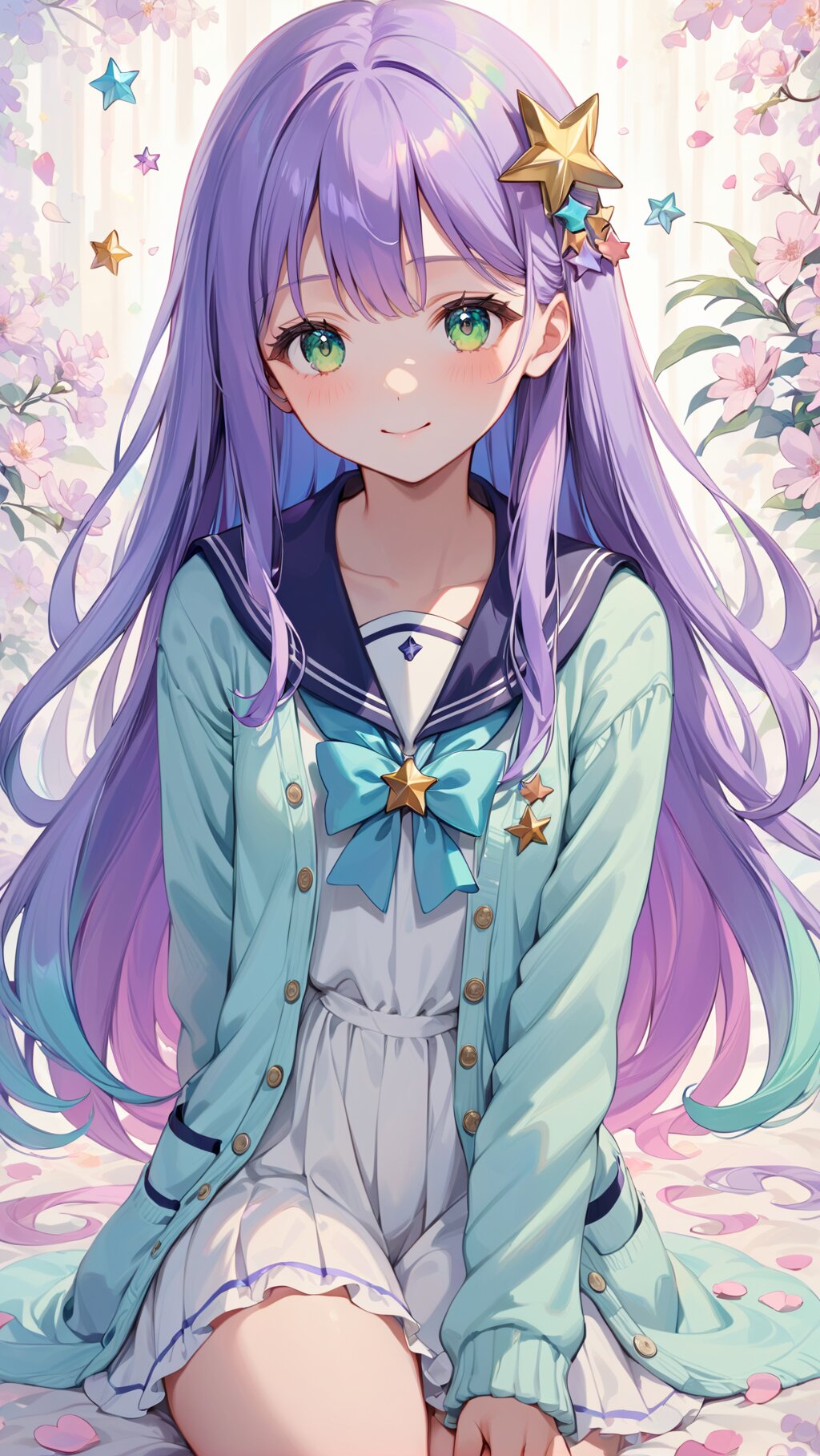 masterpiece, best quality, cute anime girl, solo, teenage, (medium shot:1.3), from head to knees, youthful appearance, soft gentle smile, straight long purple hair with clearly visible bright light blue inner color, (inner hair highlights:1.4), slightly silky hair texture, subtle waves only at ends, star-shaped hair accessory, bright green eyes, modest white one-piece dress, high neckline, long sleeves, soft flowing fabric, clean silhouette, soft natural lighting, pastel background, delicate proportions, refined and innocent appearance Very beautiful eyes, eyes of incredible beauty,, pastel color palette, soft glow, sparkles, floating petals, fluffy textures, star motifs, heart motifs, translucent fabric, soft frills, magical atmosphere, gentle light, dreamy background, faint clouds, cute accessories, subtle rainbow tones, 1girl, soft anime face, teenage, pastel purple hair, light blue inner hair, fluffy long hair, loosely wavy hair, soft flowing hair, straight-cut bangs, star-shaped hairpin, calm violet eyes, navy blue sailor uniform, light cardigan