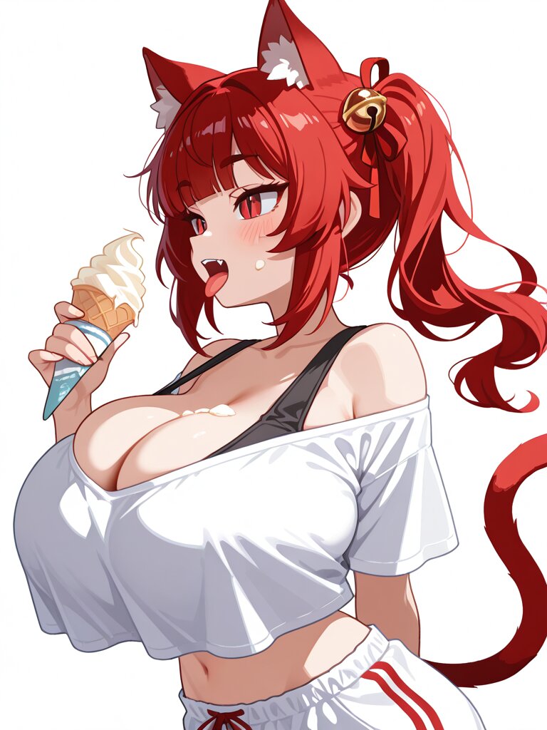 1girl,(nekomata),mesugaki,bitch brat,(gigantic breasts),emphasized deep breasts cleavage,narrow waist,red cat ears,red cat tail,two tails,jingle bell,hair bell,red ribbon,red hair,hime-cut,long side ponytail,red eyes,tsurime,slit pupils,red eyebrows,layering clothes,black sports bra,sports bra thick shoulder straps,white cropped T-shirt over sports bra,simple T-shirt,bare shoulders,crop top overhang,white culottes,blush stickers,fangs,open mouth,navel,arm behind back,:p,tongue out,licking soft serve,holding ice cream cone,cream on face,floating hair,white background,hair shade,(upper body),close up,from side,looking ahead,mesugaki,((high contrast)),(stylized),(kawaii),(anime coloring),(cute),mesugaki,gddw,((correct_anatomy)),flat color, no lineart,Bright colors, Contour line, pale painting,,black pantyhose
