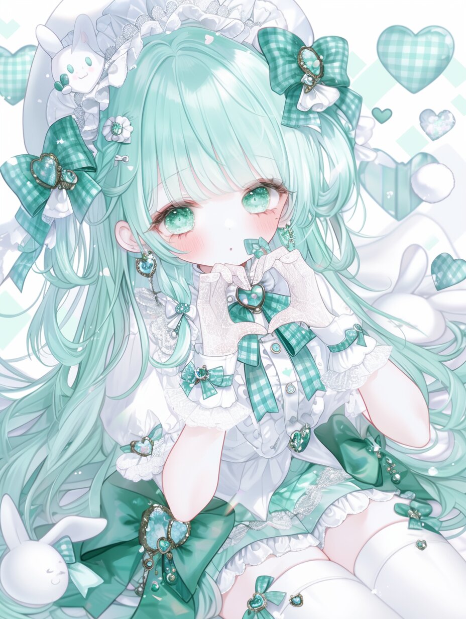 A beautiful animated girl with long emerald green hair wearing a white beret with emerald ribbons and brooches, bright green eyes, a pretty white and emerald green magical girl costume, frilly sleeves and gloves, who brings you sweet sweet sugar, a slightly mature heart, illustration of a checkered heart, very detailed pastel magic theme, full body,