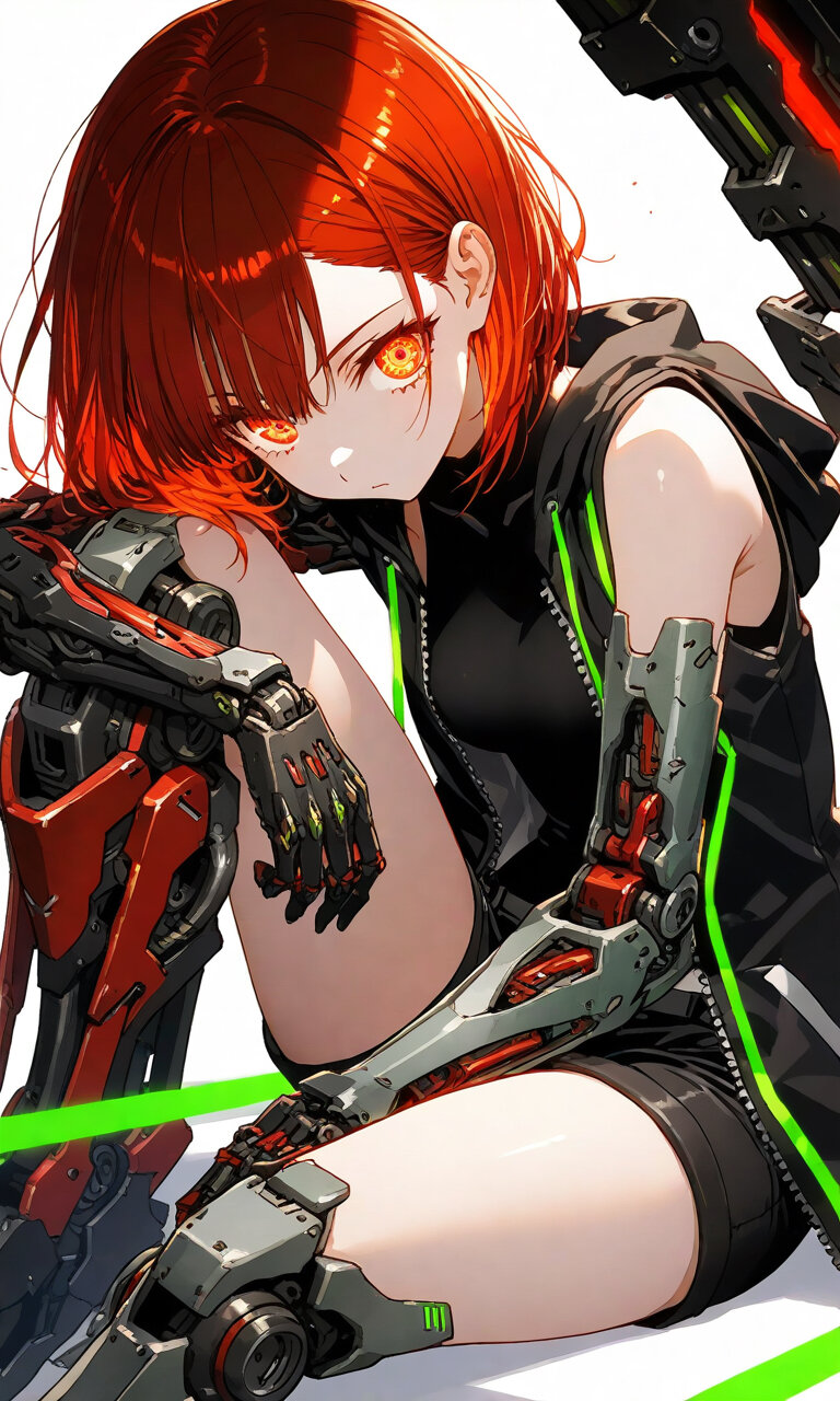 1girl, bob cut, asymmetrical bangs, red hair, open hoodie, sleeveless, red eyes, glowing eyes, mechanical legs, shorts, green line, single mechanical arm, sitting, knee up, white background, masterpiece, best quality, ultra detailed,