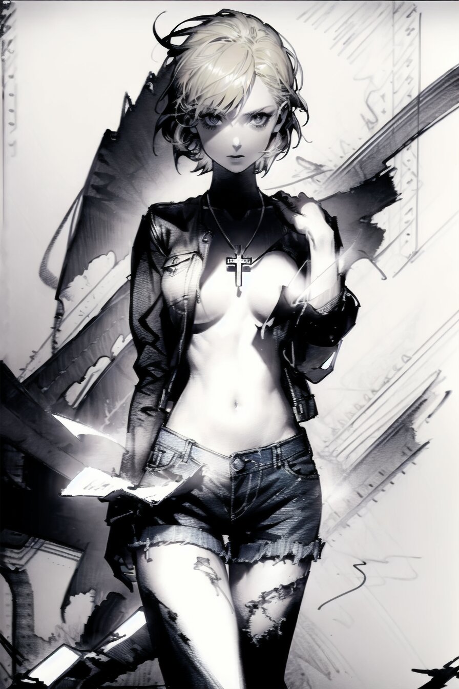 ((ultra high resolution,extremely detailed CG,official art,cinematic shadow,cinematic lighting,)),1woman,blonde short hair,smoking,Low-rise denim shorts,,black leather jacket inner no clothes,looking away,Caucasoid,cross necklace, <lora:pensketch_without_pen_lora:1>penSketch_style, monochrome, ink sketch, blue ink,