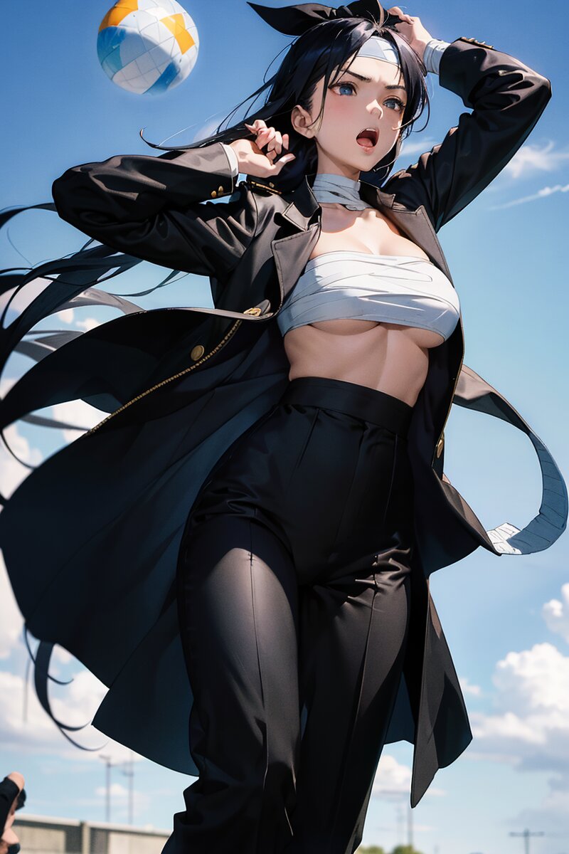 a girl,17yo,(body bandage exposed:1.3, white bandeau top), pressed breast,long sleeves gakuran,gakuran open front,black pants,bare body,hachimaki,white globe,serious,open mouth:1.5,summer,blue sky,black very long hair,